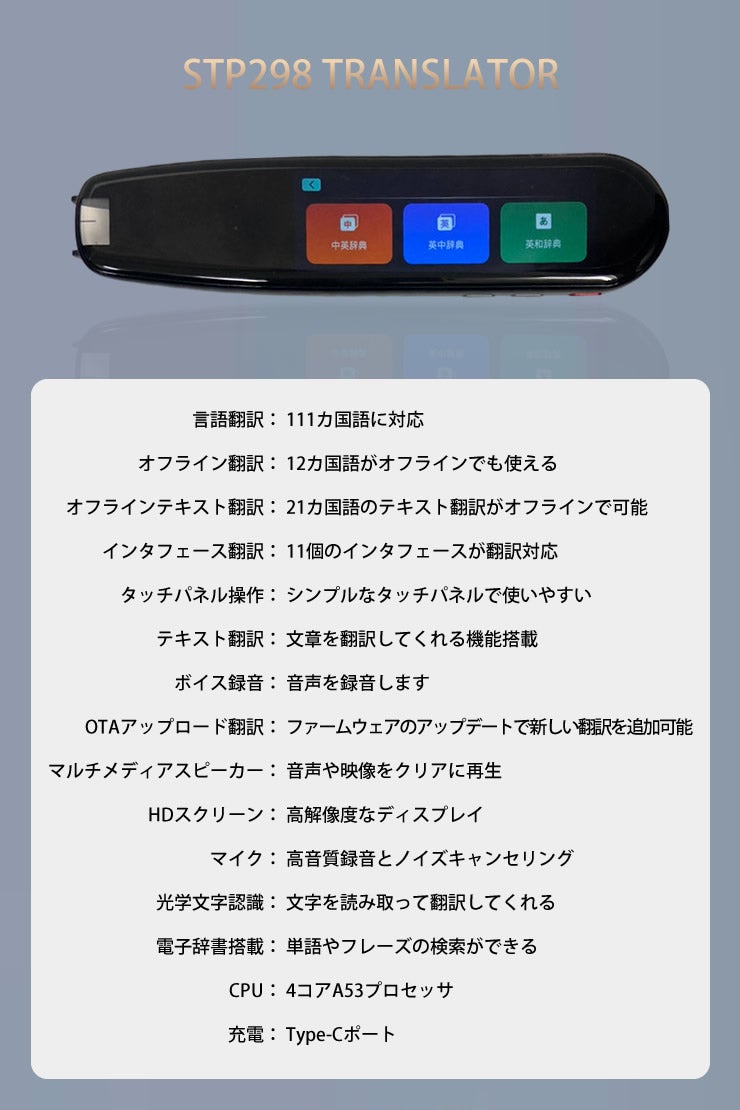 私たちの翻訳デバイス「IZELL-STP298」は、最新の技術と言語学の理論を基に設計されています。世界111カ国語に対応し、オフラインでも12カ国語の翻訳が可能。直感的なタッチパネル操作で、瞬時に言葉を翻訳し、相手とのコミュニケーションをスムーズに行うことができます。