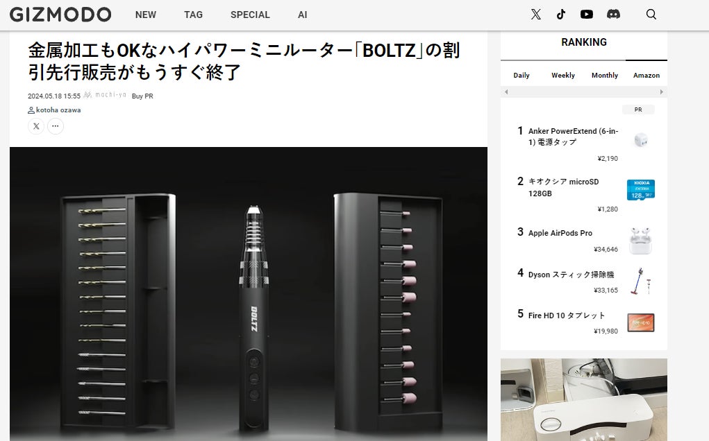 皆様こんばんは、お世話になっております。BRIGHTチームです。5月18日、Gizmodoで「BOLTZ」を紹介して頂きました。話題:金属加工もOKなハイパワーミニルーター「BOLTZ」の割引先行販売がもうすぐ終了興味がある方、是非下記のリンクからアクセスしてみてください。https://www.gizmodo.jp/2024/05/machi-ya-boltz-end-743864.html【レビューの一部抜粋】〈 対応範囲が広がるオプション主な用途が“穴をあける”や“削る”であれば基本の27点セットでOK。宝石や錆の研磨など、扱う素材の幅を広げたい場合にはアドバンスセットを選ぶと良さそうです。こちらには保護シールドもセットになっているので、破片の飛びやすい作業を行いたいや、慣れない初心者の方は安心かもしれませんね。なおビットの規格は2.2mmや2.35mmに対応しているため、足りないものがあればホームセンターなどで追加も可能ですよ!>ご興味のある方はこの機会をお見逃しなく!https://camp-fire.jp/projects/view/7298285月20日まで販売期間は続きますので、ぜひSNSでのシェアや身近な方にもおすすめしていただけると嬉しく思います。#boltz#brightdiyどうぞよろしくお願い致します。BRIGHTチーム