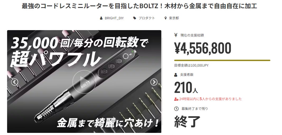 ご支援者様、お世話になっております。Brightチームです。プロジェクト開始から52日目で210人ものご支援者の方々より支援頂き、無事プロジェクト終了を迎えることが出来ました。早速皆様のリターンを2024年08月末にお届けできるよう準備を始めております!皆様にご満足いただけるリターンをお届けできるよう、全力で取り組んで参りますので引き続き、「最強のコードレスミニルーターを目指したBOLTZ!木材から金属まで自由自在に加工」をよろしくお願い致します。BRIGHTチーム