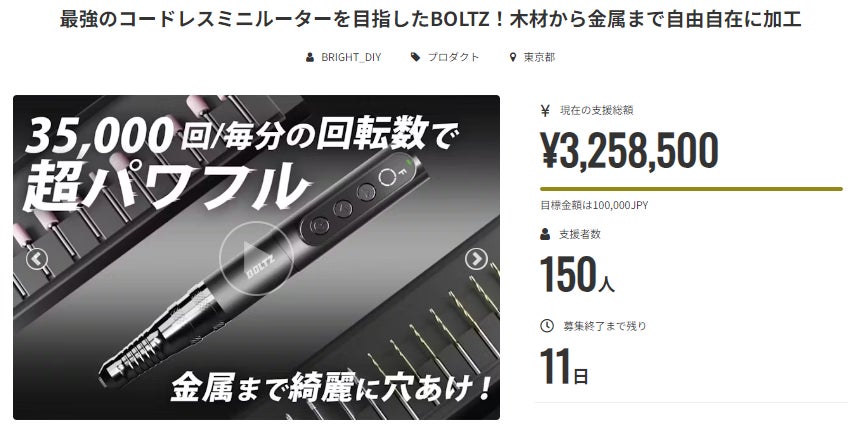 この度は「最強のコードレスミニルーターを目指したBOLTZ!木材から金属まで自由自在に加工」に支援頂き誠にありがとうございます!お陰様で、開始から150名の方に支援してを頂くことができました。ご興味のある方、ぜひ支援お願い致します。https://camp-fire.jp/projects/view/729828Brightチームは、当プロジェクトをもっと多くの方に知っていただきたいと考えております。よかったら、FacebookやTwitter等のSNSでのシェア・拡散をお願い致します。#brightdiyどうぞよろしくお願い致します。Brightチーム