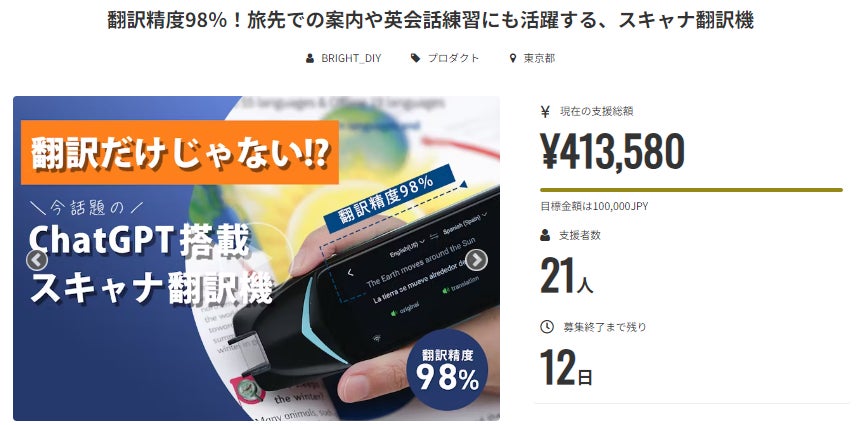 この度は「翻訳精度98%!旅先での案内や英会話練習にも活躍する、スキャナ翻訳機」に支援頂き誠にありがとうございます!お陰様で、開始から10万円の目標金額を400%達成することができました。< 旅先で翻訳機としての使用はもちろん、Chat GPTに話しかければ色々なことを教えてくれる!まだ人と英会話するのに自信がない方は英会話の練習相手として使ったり、英語を忘れないための話相手としても!スキャンした文章はPCやスマホと連携可能なのでwordやpptにも落とし込めて業務効率化にもおすすめ!>ご興味のある方、ぜひ支援お願い致します。https://camp-fire.jp/projects/view/729829Brightチームは、当プロジェクトをもっと多くの方に知っていただきたいと考えております。よかったら、FacebookやTwitter等のSNSでのシェア・拡散をお願い致します。#brightdiyどうぞよろしくお願い致します。Brightチーム