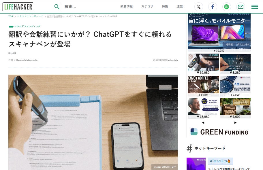 皆様、こんばんは !Brightチームです。お世話になっております。先日 、LifehackerでNEWYES ChatGPT搭載翻訳ペンを紹介して頂きました!話題:翻訳や会話練習にいかが? ChatGPTをすぐに頼れるスキャナペンが登場 是非下記のリンクからアクセスしてみてください。https://www.lifehacker.jp/article/machi-ya-start-chatgptpen-729829/【レビューの一部抜粋】〈 様々な方法で翻訳OKPCやスマホとの連携が可能。紙面からスキャンした翻訳文をそのまま取り込むめるので、その後の編集もラクでいいですね!カメラも備えているので、レストランのメニューなどもその場で理解できますよ。こちらは翻訳機らしい使い方の音声翻訳。母国語で話た内容を翻訳し、そのまま読み上げてくれるのでショップでの応対や簡単な商談など、活躍シーンは多そうです。電子辞書機能も備わっているので、語学学習にも便利ですね! 〉ご興味のある方、ぜひ支援お願い致します。https://camp-fire.jp/projects/view/725389Brightチームは、当プロジェクトをもっと多くの方に知っていただきたいと考えております。よかったら、FacebookやTwitter等のSNSでのシェア・拡散をお願い致します。#newyes #brightdiyどうぞよろしくお願い致します。Brightチーム