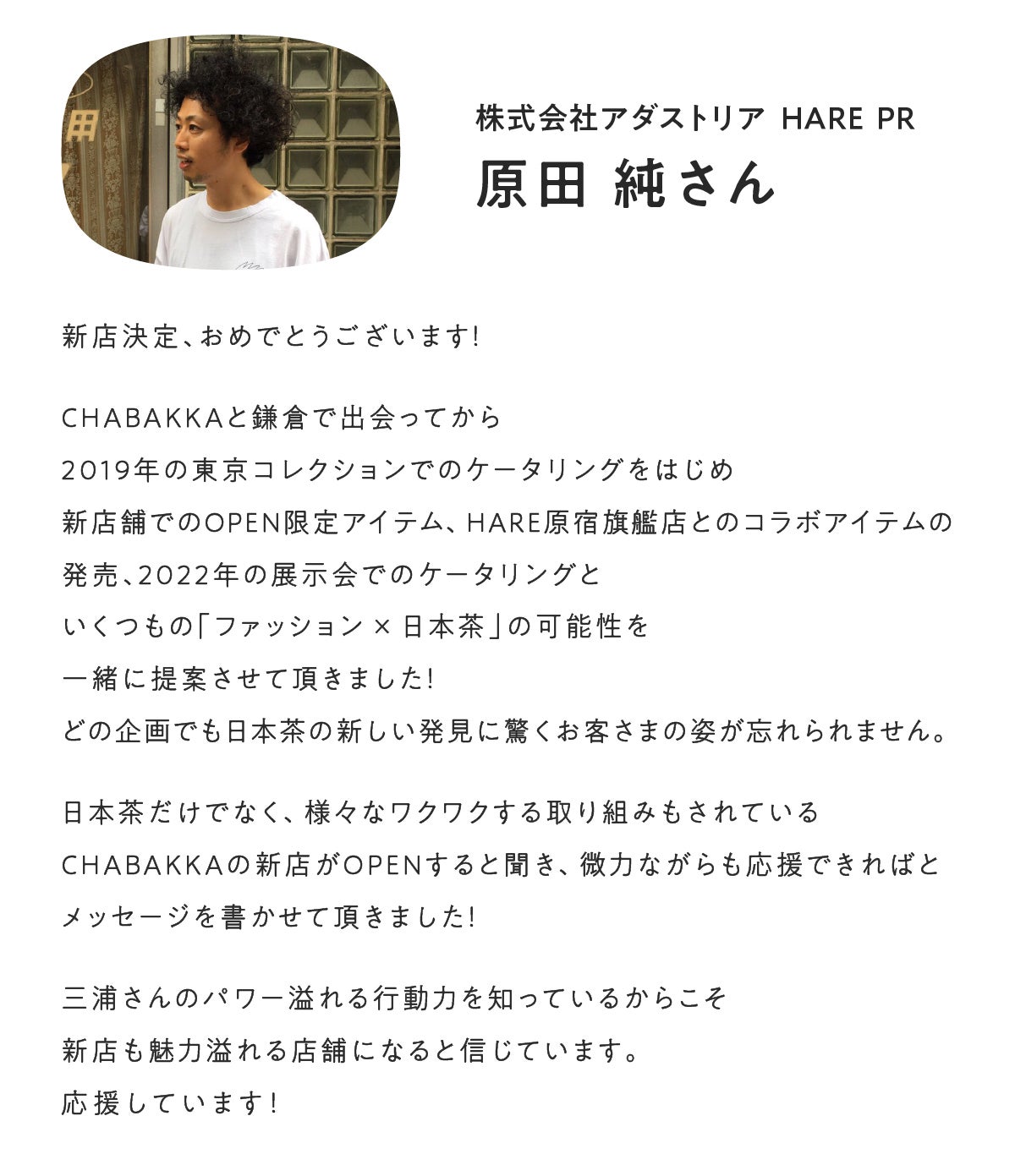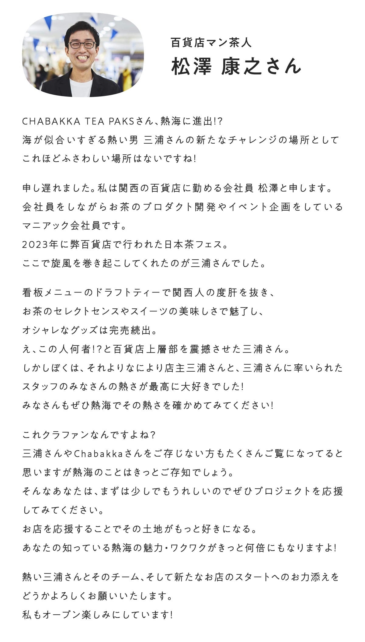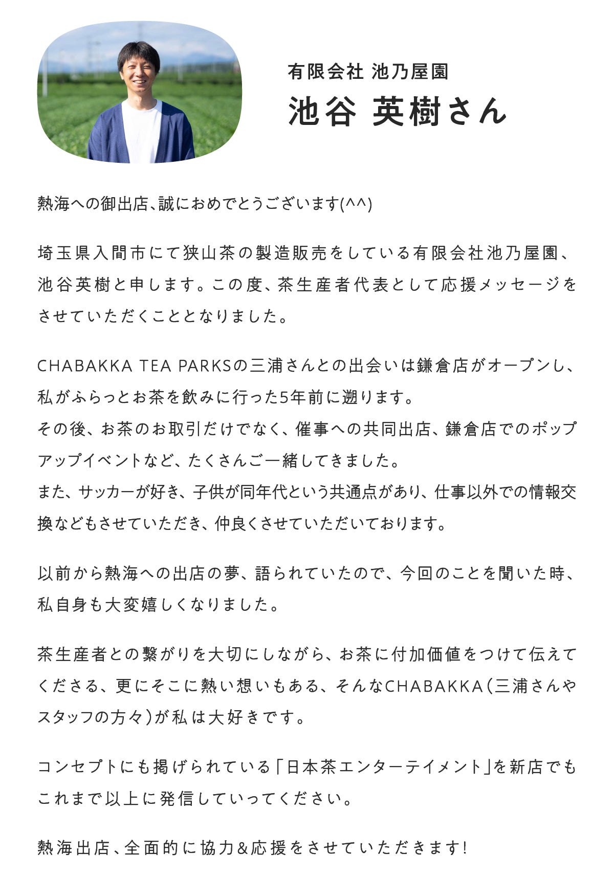 2024/04/27 10:00昨日4月26日、無事にCHABAKKA TEA PARKS熱海店をオープンさせていただきました!昨日の営業の様子をInstagramのストーリーにてご紹介しておりますので、よろしければご覧ください↓↓(フォローもお願いします!)熱海店Instagram近隣の皆様はもちろん、遠方からめがけて来ていただいた方、観光でいらっしゃった方、メディアの皆様、オープン初日からとってもたくさんの方々にご来店いただき、本当にありがとうございました・・!!前日まではどうなることやらとワクワクと不安でいっぱいでしたが、大変楽しいオープン初日となり一安心です。スタッフのみんなもお疲れ様でした!!そして今日からGW突入で、いよいよ怒涛日の日々が始まります。ぜひ皆さまこの機会に遊びにいらしてください!そして、同時にクラウドファンディングプロジェクトも終了し、大変多くの方々にご支援いただきまして、誠にありがとうございました。また改めて今回のプロジェクトの振り返りと感想をお知らせさせていただきます!まずは取り急ぎ、御礼とご報告だけさせていただきます。それでは今日から始まるGW、1人でも多くの方にお会いできるのを楽しみにしております!!今日も素敵な1日を!!!! もっと見る