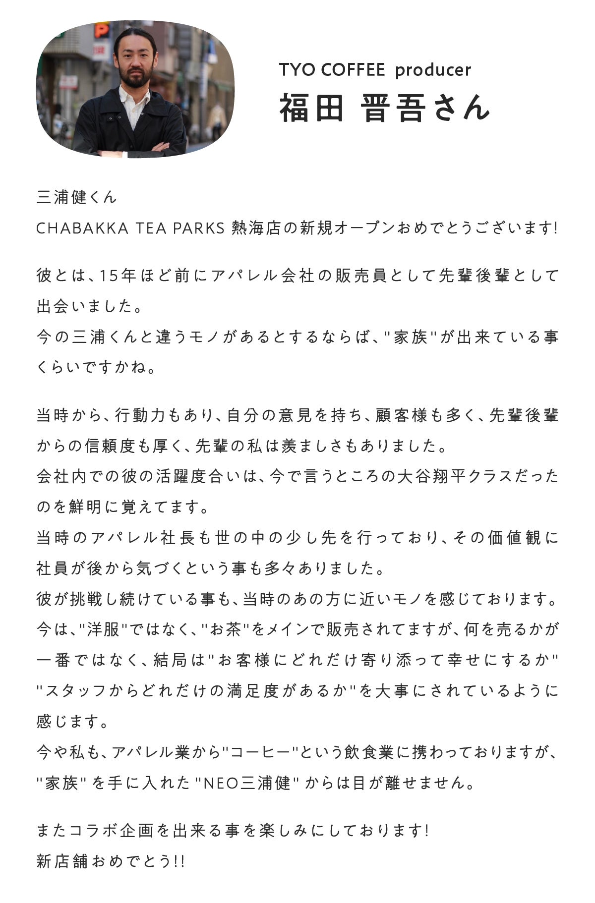 2024/04/25 19:00今回の活動報告は、リアルな思いを書かせていただきます。文章がカジュアルなのと、少し長い内容になりますが、ご容赦ください。それではどうぞご覧くださいませ。CHABAKKA TEA PARKS6周年を迎える明日4月26日、いよいよ熱海店がオープンします。まずは無事に6周年、そして熱海店のオープンを迎えさせていただいたことに深く感謝いたします。そして本プロジェクトにご支援いただいた多くの皆様、誠にありがとうございました。今回は結果として、会社としては最大、個人としては3本の指に入るレベルのプロジェクトになりました。熱海店のオープンに関しては、時間も労力もコストも最大限投下し、エネルギー全開で去年の暮れから突っ走ってきました。特に4月に入ってからはほぼ毎日早朝から深夜まで、熱海と鎌倉を行き来していて、さすがに挫けそうでしたが、今では良い思い出。思い返すと、熱海出店を構想したのが5年前の2019年。度重なる苦難や紆余曲折がありましたが、多くの皆さんの支えがあり、なんとかこの日を迎えられました。諦めなくて良かったです。5年前、市場調査がてら弾丸で熱海に訪れた際に知り合い、そこからずっと口説き続けてくれた三好さんは、熱海出店の最大の恩人です。その運命的な出会いから、熱海で仕事をさせていただく中で関わらせていただいた現地の皆様。鎌倉店オープンの時同様、設計や内装デザインに強力してくれた大親友のブーちゃん。無理なスケジュールを聞いていただき、2月から約2か月半、寝る間も惜しんで施行していただいた大工の島崎さん。オープンに向けて一丸となって準備してくれたCHABAKKAチームのみんな。いつも最高のプロダクト、ブランディングを表現してくれるデザイナーの下田さん。そして、昨年末から約5か月、仕事にフルコミットさせてもらって、多大なるサポートをしてくれた妻。疲れてヘロヘロな時に元気と癒しをくれた4人の子供たち。みなさん、ホントにホントに感謝でいっぱいです。1人じゃ決して作り上げることはできなかったな。みんなの思いや力を乗せて、4月26日にCHABAKKA TEA PARKSは7年目に突入し、熱海店をオープンさせます!最高のお店、スタッフ、商品、サービスを以てお届けしていきますので、これからのCHABAKKA TEA PARKSにどうぞご期待ください!最後までお読みいただき、ありがとうございました。PS.4月26日からGW最終日の5月6日までは基本熱海におりますので、タイミング合う方はぜひ遊びにいらしてください! もっと見る