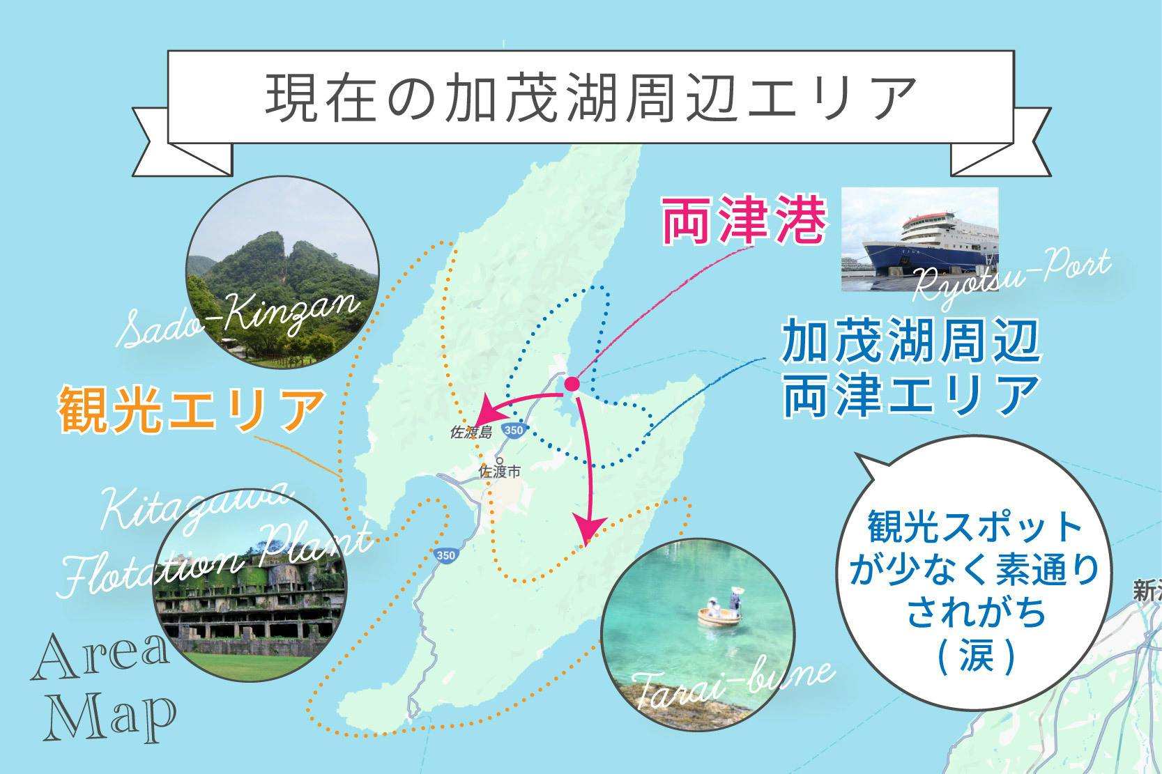 佐渡島はこれから世界遺産登録もみえてきて注目度が上がってきてはいるものの、佐渡の玄関口である両津港周辺は、観光客が時間を費やすスポットが少なく、現状では、佐渡金銀山のある相川地区や、たらい舟や国の重要伝統的建造物群保存地区に選定されている宿根木地区への通過点になってしまっています。