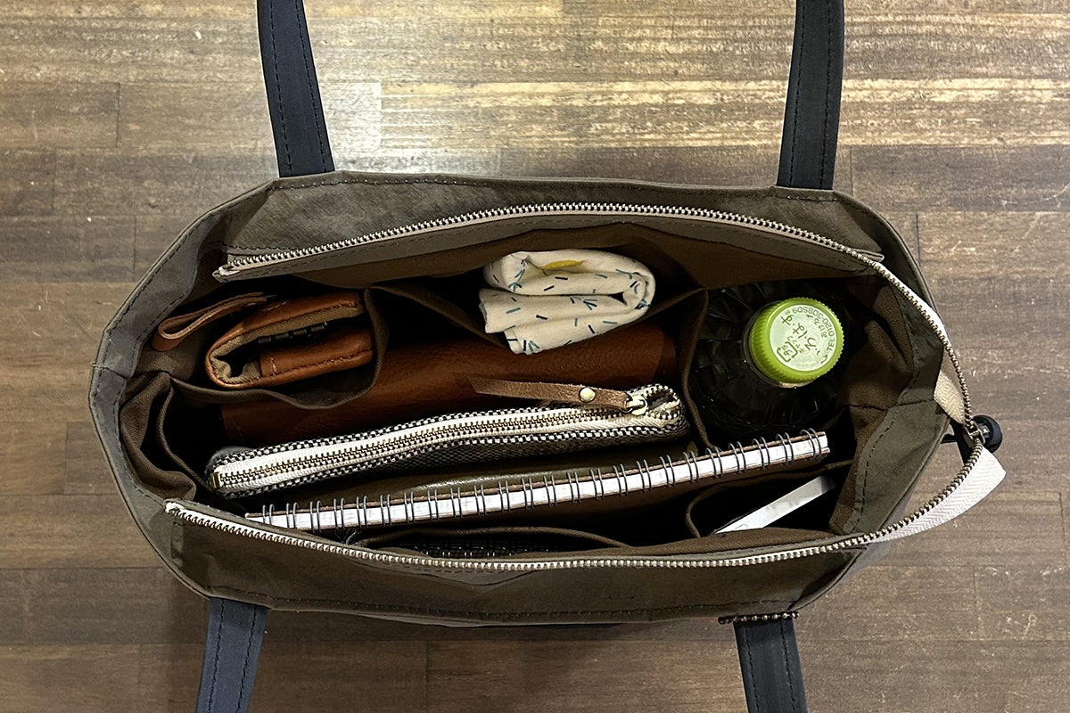 A4ファイル、ポーチ、長財布、500ml水筒、文庫本、キーケース、スマートフォン、メモ帳、ハンカチ入れてみました。