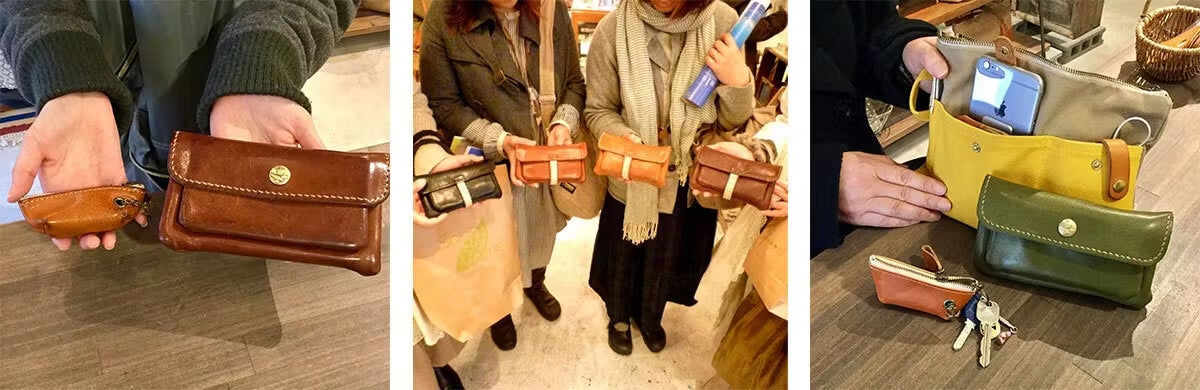 ▲革小物は皆さん味出しを楽しんでいます。タンニン鞣しのレザーは使い込むほどにツヤが出ます。