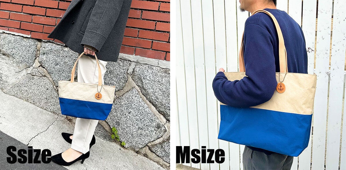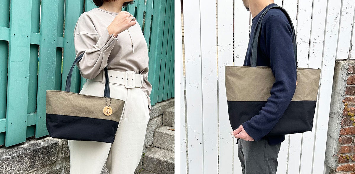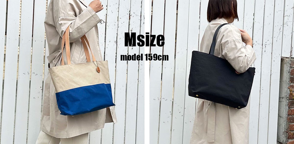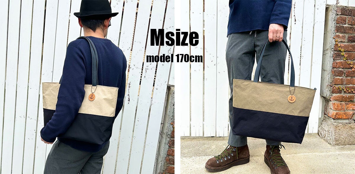 元々は女性向けにデザインしたバッグでしたが、以前より男性の方からの要望も多く、今回の新素材でのプロジェクトをきっかけにMサイズの方を、持ち手の長さや太さなどを調整して男性にも使っていただけるサイズ感に変更いたしました。(もちろん女性もOKです!!)