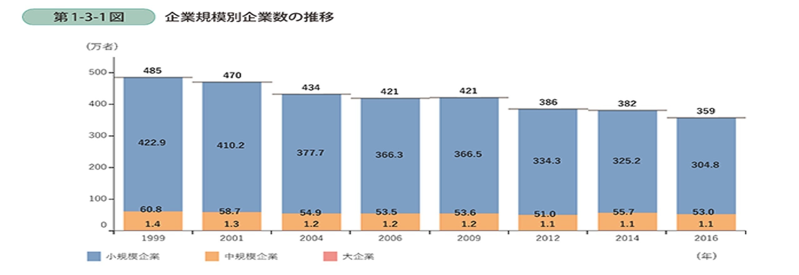昨今、コロナの影響に関係なく、中小企業数は1999年から激減しています。2021年10月現在は、コロナの影響により、さらに減っている事が予測できます。