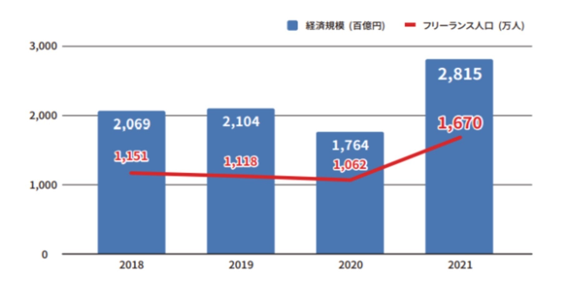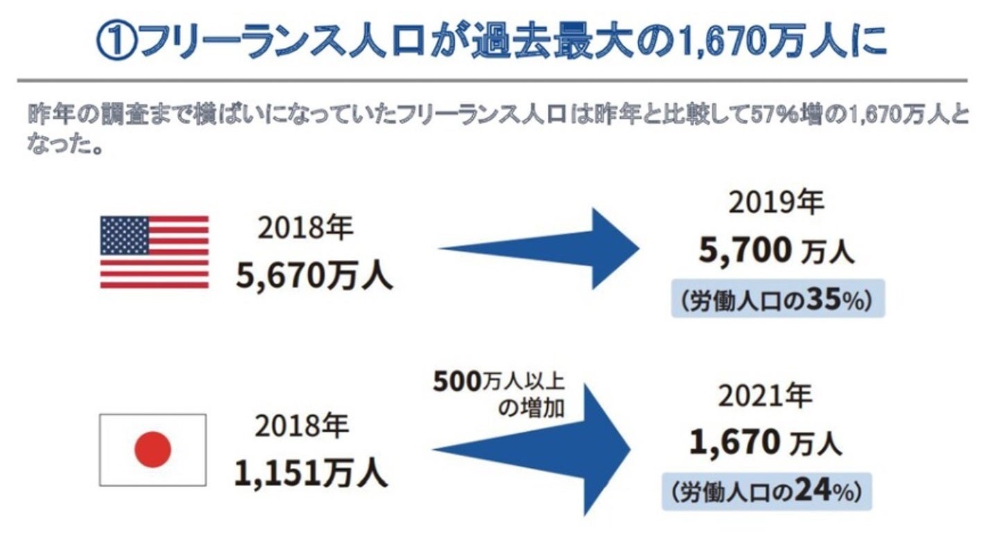 労働人口に占めるフリーランスの割合は アメリカで35%に対し日本は24%となっており、 経済規模は今後も成長の余地があると考えられます。また、経済規模も2021年には約10兆円増加し、28兆円と過去最大になりました。
