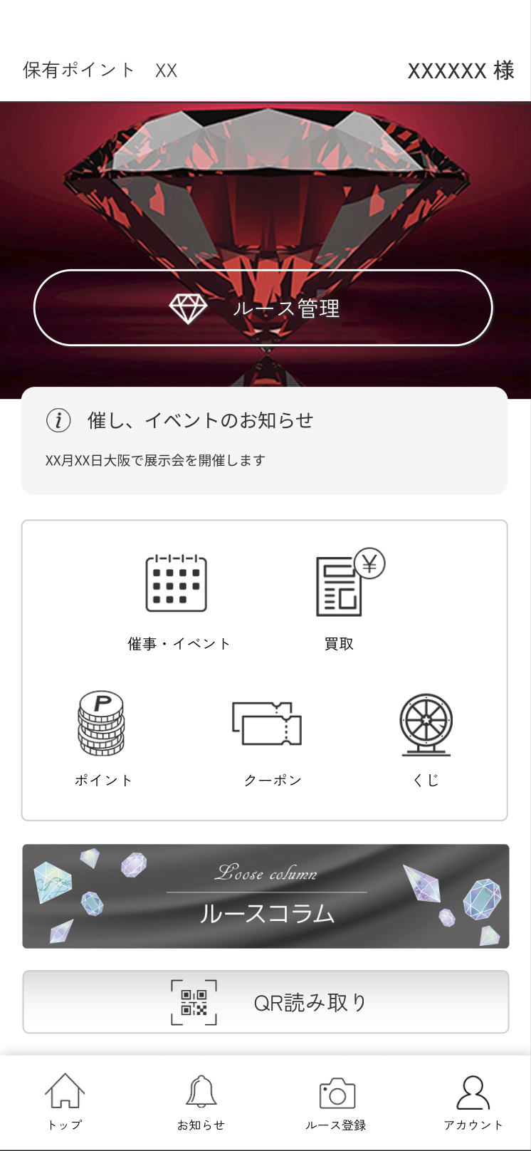 アプリに登録すると自分のジュエリー、ルース、原石、ブレスなどのコレクションが管理できる他、登録しているだけで展示会で使えるポイントやクーポンの発行、宝石ルースのプレゼントなども実施する予定です。