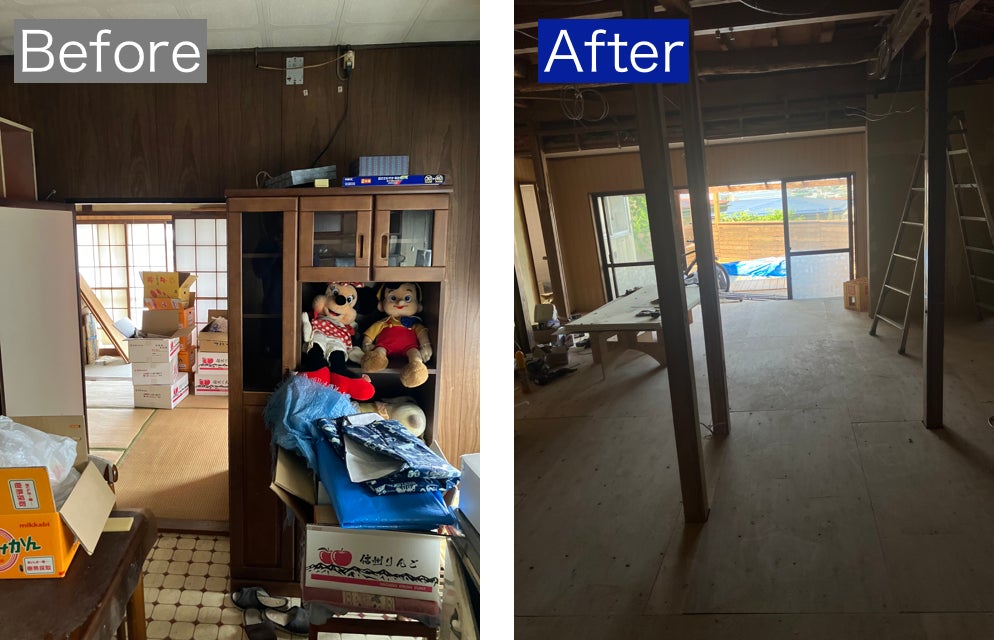 ・1F: 古い壁と天井を撤去して、開放感のある空間を実現しました(破壊の際は、プロ監修のもと実施)。床をコンパネで貼り直しました。広い空間にすることで、開放感あふれるリビングや、ワークスペース、寝室などを自由にレイアウトできるようになります。