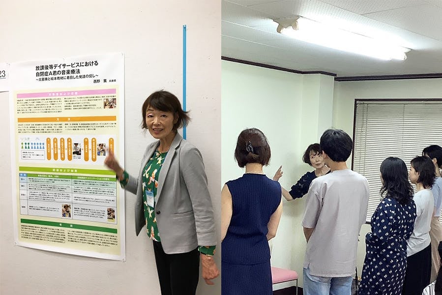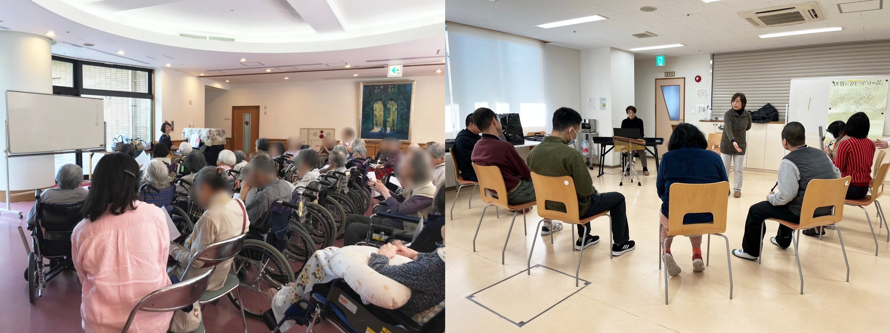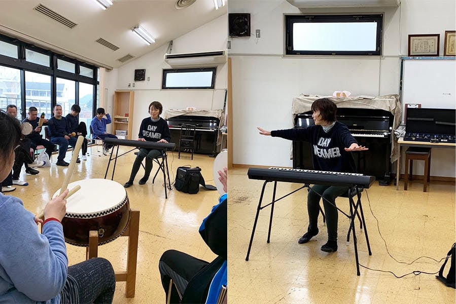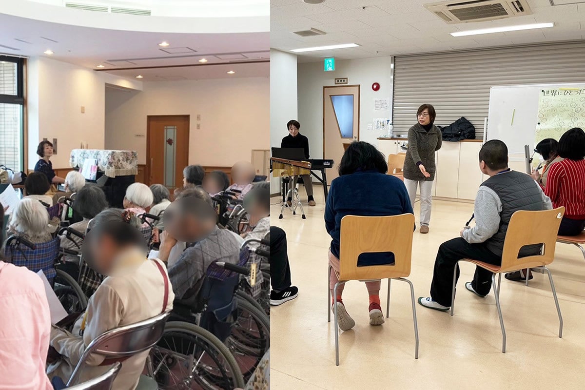 「はじめ、音楽療法は私たち施設スタッフは全くわからなかったのですが、先生がされているように単なる声掛けだけでなく、音楽に合わせて声掛けすると、利用者のみなさんは、スッと席に戻られたりして、効果があるなと感じました。音楽療法のイベントがある日を利用者さんは毎月楽しみされていて、その日はとても調子もよく落ち着いた気持ちで参加されています。