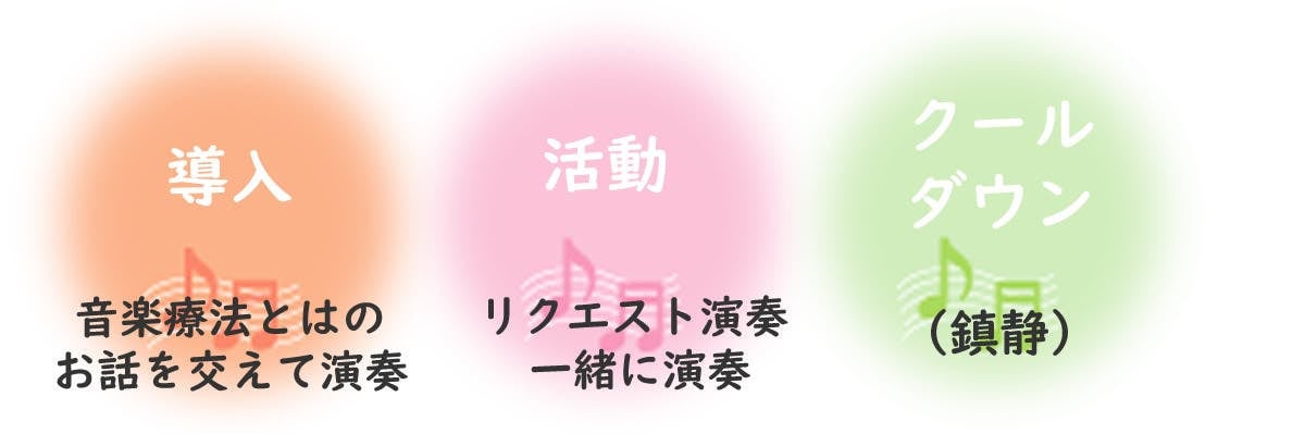 音楽療法を取り入れたセラピーは、通常、導入→活動→クールダウンの順に進めていきます。