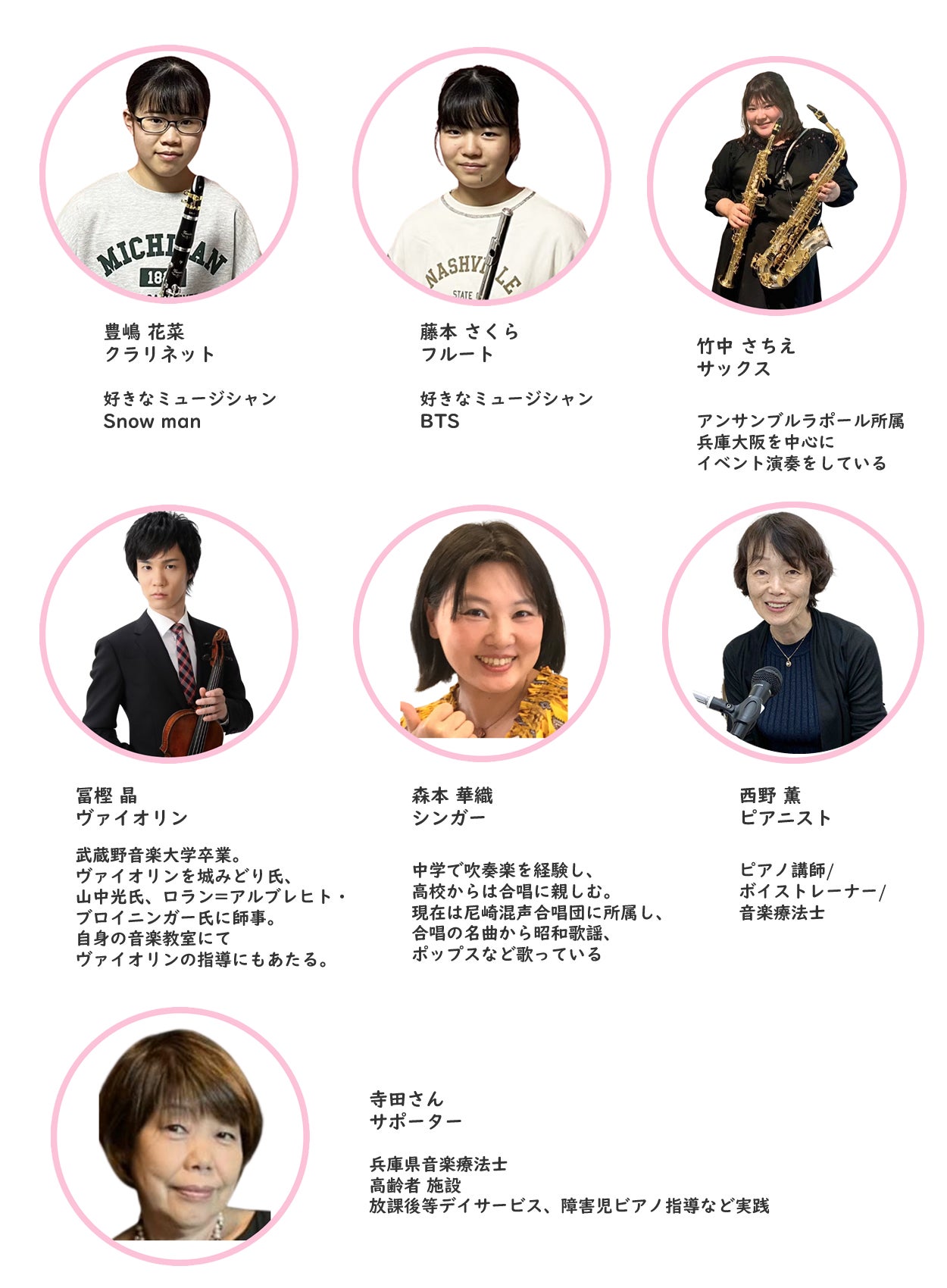 そういった背景から、奏者には、すでに第一線でプロとして活躍中の方ではなく、将来音楽の仕事で生きていきたい学生や、これまで個人で音楽活動を続けてこられた方たちを中心に、出演者を構成しています。