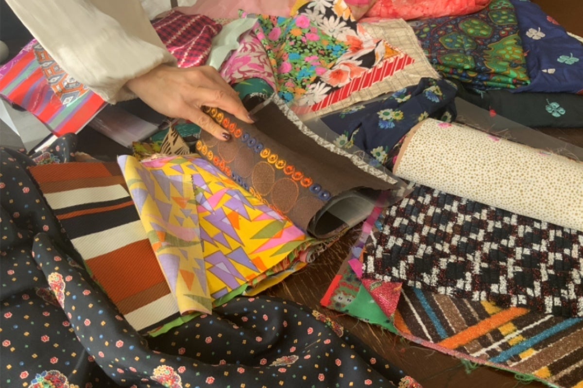 サンプルの生地を見ながらどのように観せていくか思いを巡らせています(写真はほんの一部です)
