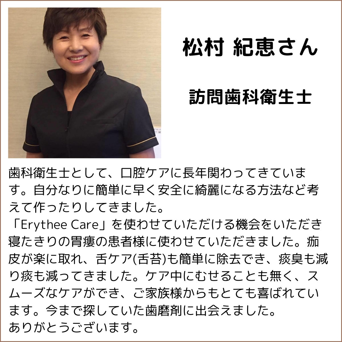 2024/04/15 08:00クラウドファンディング初挑戦も本日が最終日となりました!歯科業界に入って15年。院長やスタッフと共に患者様に関わってまいりました。来る日も来る日も、歯の痛みや治療に来られる患者様と接するうちに歯のお手入れ、お口の環境について歯磨きの大切さは教えてもらったかもしれないけどそれがなぜ、必要なのか本質は学校では教えてくれなかったなと思っていました。そんな中、自分なりに調べてみると口腔内細菌が全身の疾患と関連していることを知りました。妊婦さんにもかなり影響があるということも初めて知りました。口腔ケアが生まれる前から影響している。ものすごく大切なことなのに知らない方が多いことに愕然としました。これはもっと啓発していく必要がある!!そう感じていた頃、訪問歯科に同行するようになり在宅でお過ごしの方のお口の状態を目の当たりにして「この状態を改善するにはどうすればいいのだろう』「短時間で効果の出るケアの方法なないのかな』など模索するようになりました。そんな時出会ったのが、とある歯磨き粉です。使用して数ヶ月で効果はテキメン!スタッフと一緒に感動したことを今でも鮮明に覚えています。それくらい衝撃でした!歯根部分の歯石が綺麗に撮れています。歯磨き粉だけでここまで除去できるのは在宅ケアの方にとっては嬉しいですね。舌磨きはデリケートです。方法を間違えると味覚障害まで招きかねません。歯磨き粉を変えるだけで効果が期待できます。口腔カンジダは一度なると根治が難しいと言われています。どうせ治らないという諦めや口臭もひどく、ケアすること自体、億劫になりがりでますます悪循環の患者様でしたが歯磨き粉で優しく拭き取るだけでこれだけの効果がありました。これは私自身が実際、体験した患者様の写真です。患者様ご自身に喜んでいただけるのはもちろんですが、ご家族の方に本当に喜んでいた大たのがよかったです。エリスリーケアはさらに新しい成分を加え、オリジナルレシピで開発しています。この歯磨き粉で、1人でも多くの方が健幸で笑顔になっていただくお手伝いができれば幸いです。この想いに賛同くださった方には心からお礼申し上げます!!!本当にありがとうございました。本日が最後となります。23:59:59まで、諦めず頑張ります!どうか最後のご支援をお願いいたします。 もっと見る