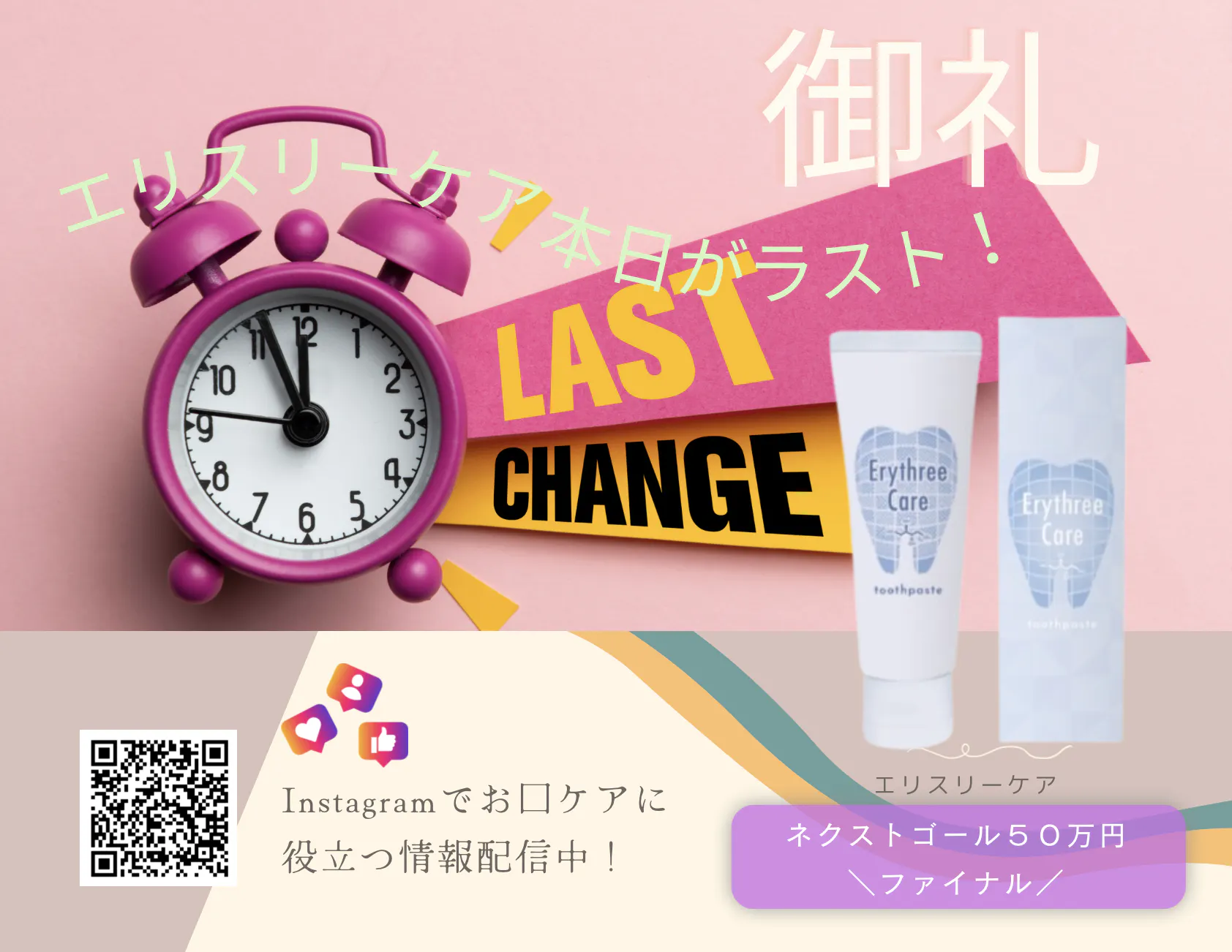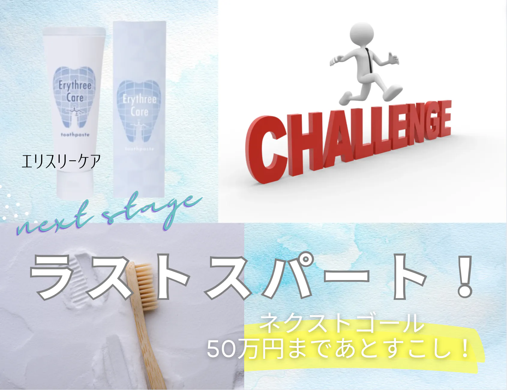 2024/04/13 08:00エリスリーケア クラウドファンディングチャレンジ!残すところあと3日となりました!!!この素晴らしいプロジェクトへのご支援、本当にありがとうございます!最後のステップに到達するために、さらなるサポートが必要です!私たちは、歯磨き粉の力で世界中の笑顔を広げることを目指しています。口腔健康は全身の健康にも影響を与える重要な要素です。私たちの歯磨き粉は、高品質な成分と効果的な配合で、虫歯や歯周病などの口腔トラブルを予防し、口の中を清潔で健康的な状態に保ちます。私たちの夢を実現するためには、あと一歩のご支援が必要です。最後の追い込みに向けて、皆さんの力が必要です。ぜひ、このプロジェクトに参加し、私たちの歯磨き粉を支援してください。あなたの一歩が、多くの人々の健康と笑顔を守ることにつながります/〜〜最後のスパートをかけて、私たちの夢を共に実現していきましょう!皆さんの温かいご支援に心から感謝いたします。どうぞよろしくお願いいたします! もっと見る