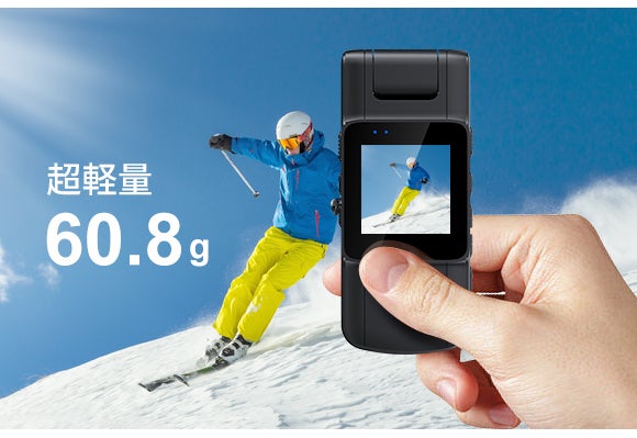 わずか60.8gの重さで、コンパクトで持ち歩くしやすい。片手でらくらく撮影!