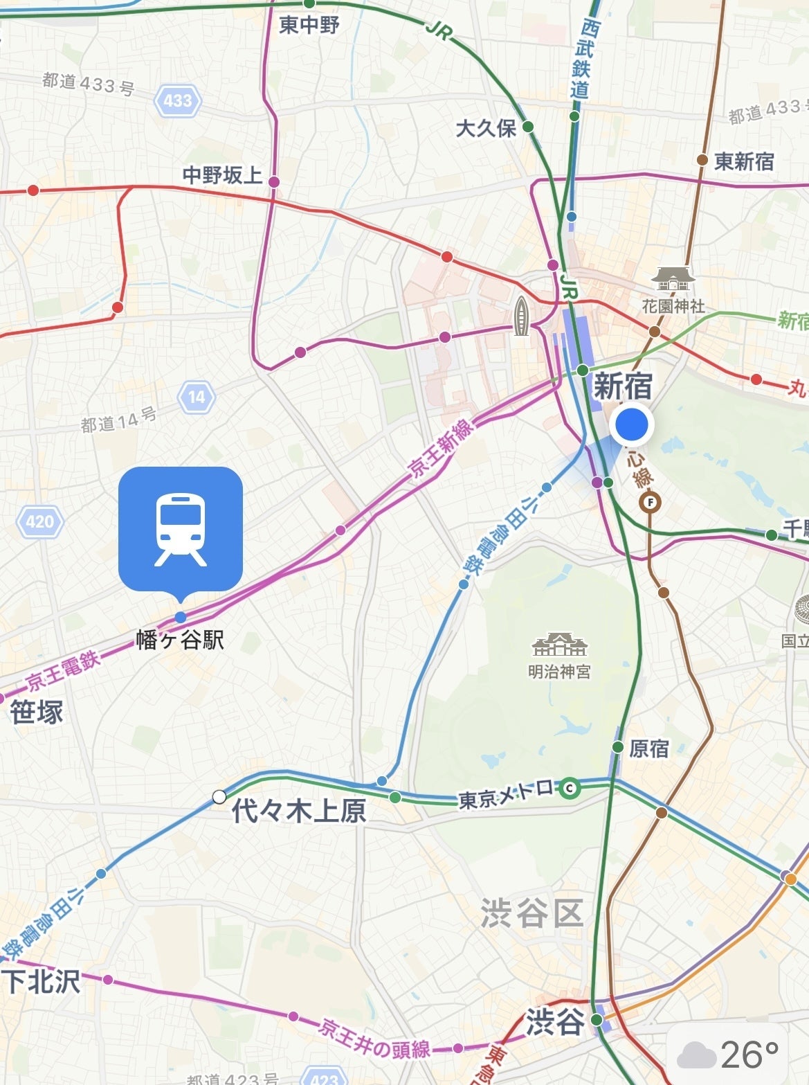 幡ヶ谷駅は新宿駅から京王線新線という路線で西に2駅の位置にあり、物件は駅から徒歩5分の所になります。