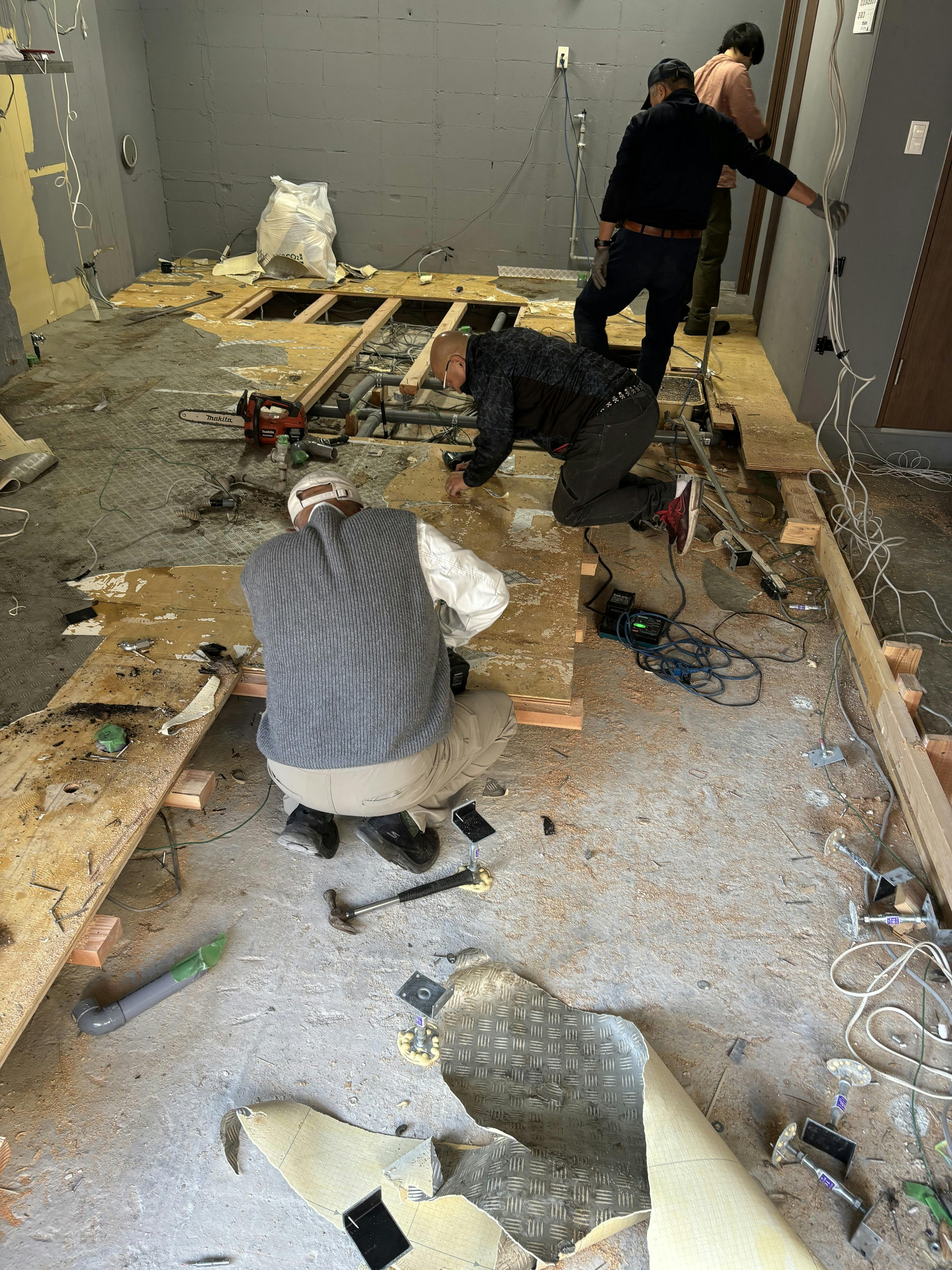 以前の図面がないとのことで気持ちが悪いので一旦床を剥がす事にしました。飲食店ではこの床下にガス管や水道管が通っています。