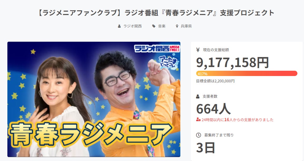また支援総額も、『もしやラジオ関西ワイドFMの周波数「91.1」にちなんだ911万円に到達するのかも・・・』と思っていたら勢いが凄すぎて突破して、さらに先に進んでいるラジメニアCFの最終盤の状況です。
