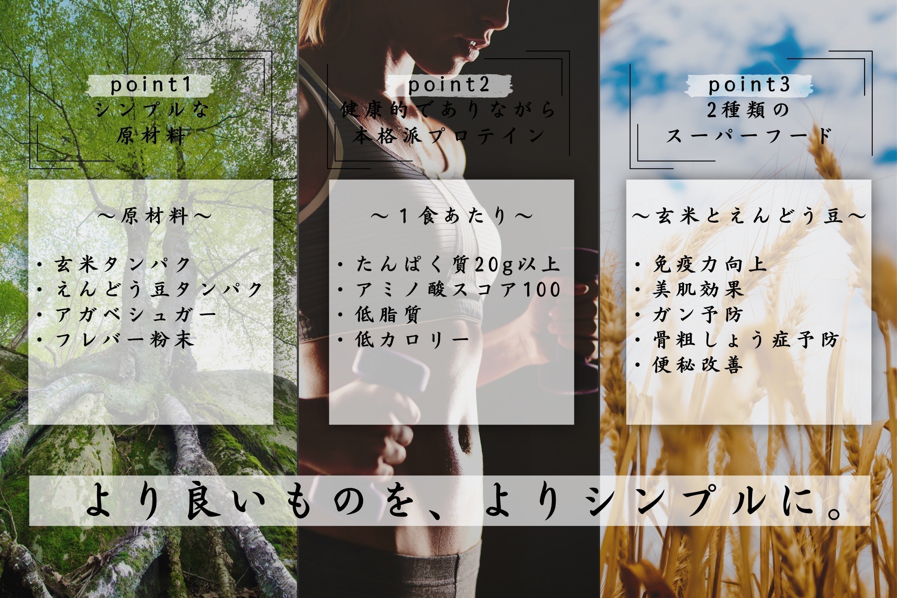 スーパーフードの有機玄米とえんどう豆の豊富な栄養素により、筋力の増大や回復、必要栄養素の素早い摂取が可能となるほか、美容や健康面でのメリットを一度に摂取することができます。
