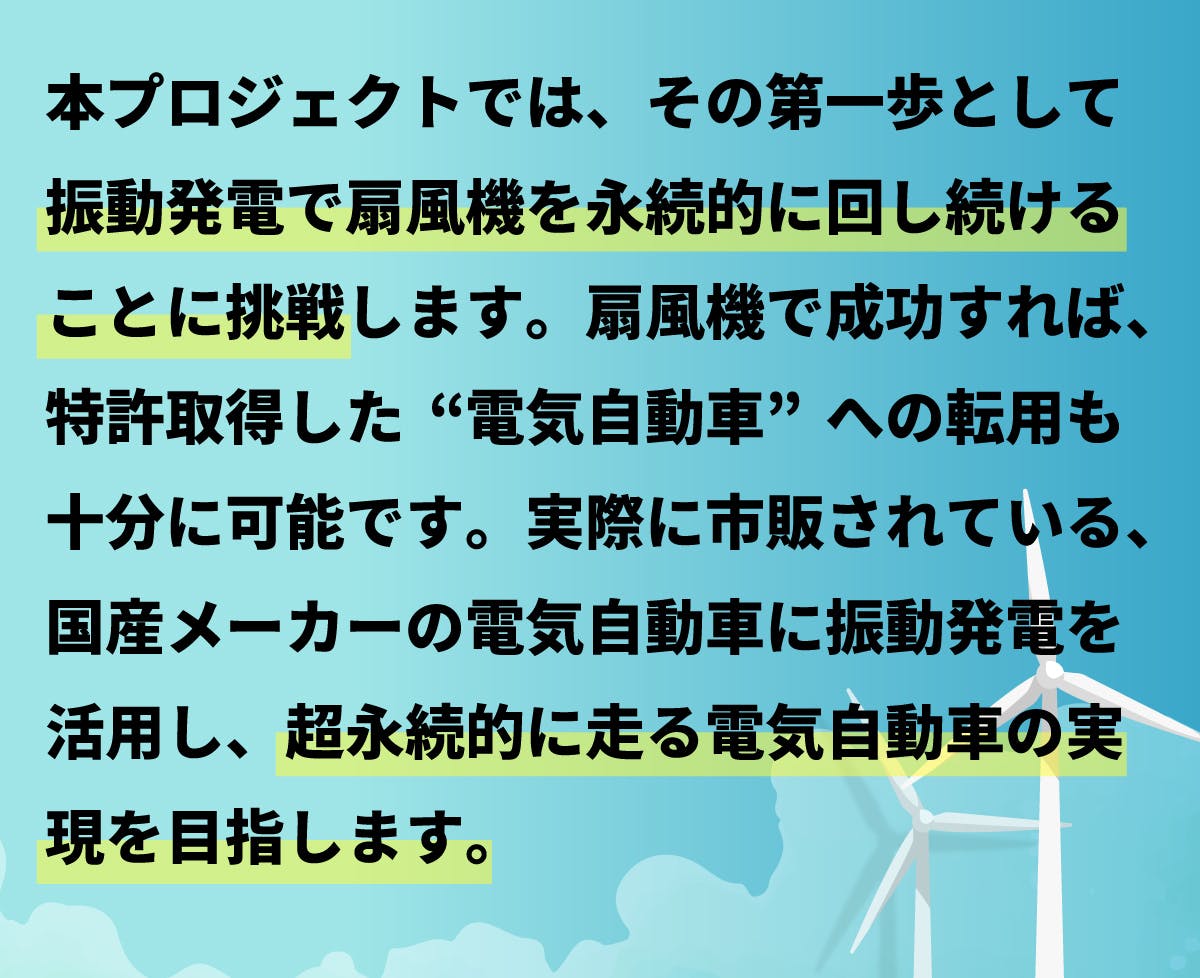 この実現のカギとなるのが“電気自動車”の特許に使用する振動発電です。