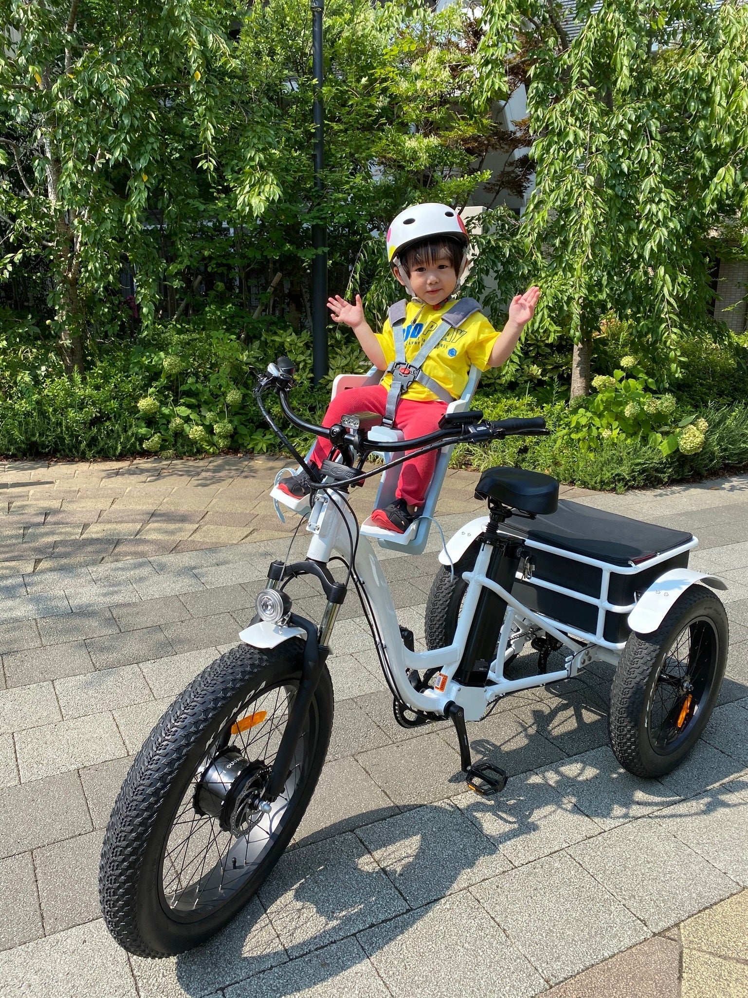 (電動アシスト式三輪自転車商品では、子供乗せ活用していました。フル電動モデルは2人乗りが禁止となります。)