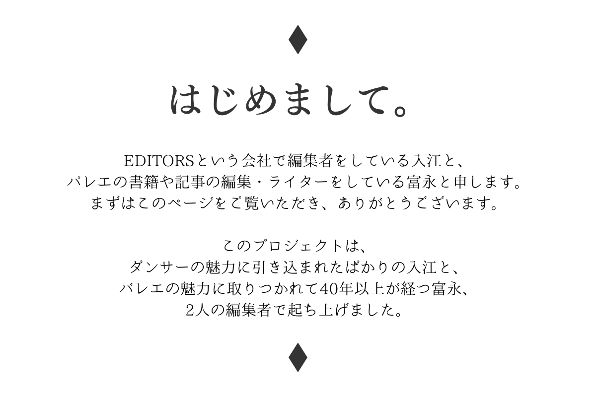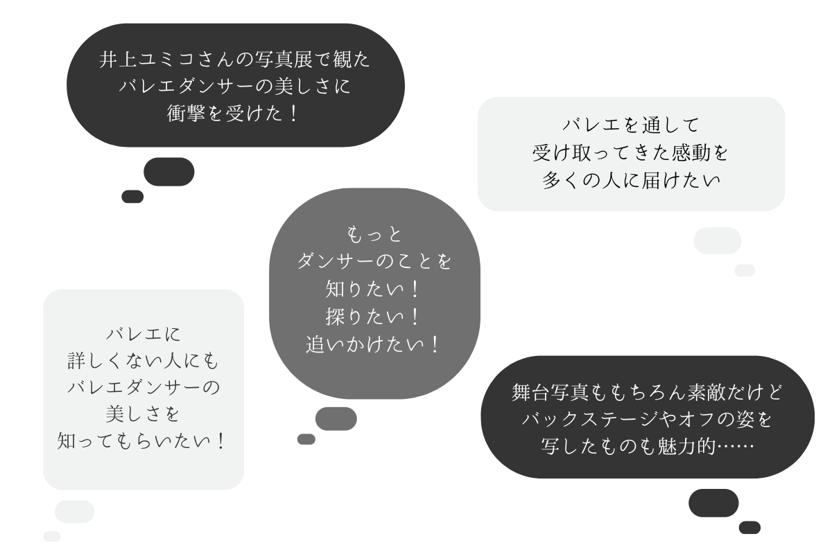 ダンサーをはじめ、バレエを愛する方、ダンサーのファンの方、現在バレエ教室に通っている方、その保護者の方たち、子どもの頃にバレエ教室に通っていた方々……。バレエに詳しい人も、そうでない人も、さまざまいろんな方とともに、ダンサーの美しさ、素晴らしさを再認識していきたい。そして、日本のアートに対する関心をもっともっと高めていきたい、と考えています。