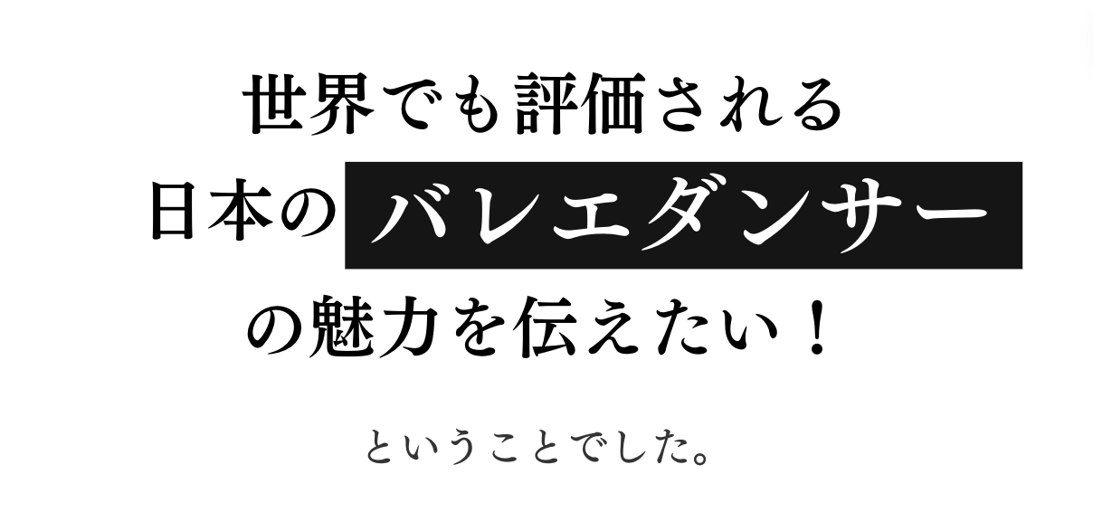 バレエをご存知ない方には、まだ見ぬ美に出合い、心に豊かさをプラスして欲しい。バレエをよく知る方には、ダンサーのさまざまな面を知り、よりバレエの奥深い美に触れてほしい。そう願っています。