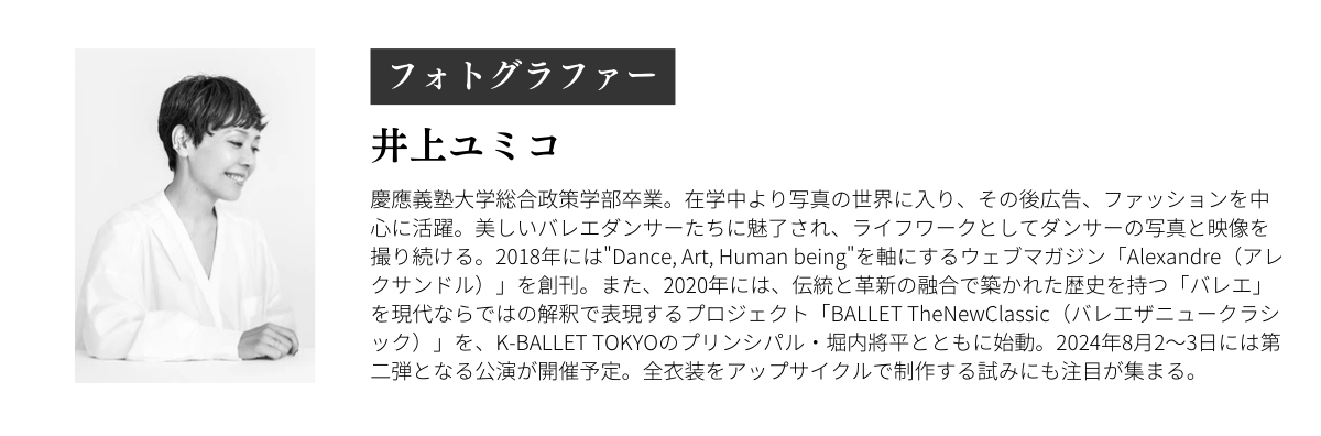 撮影は井上ユミコさん。美しいバレエダンサーに魅了され、ダンサーの写真や映像を撮り続けている彼女だからこそ、とらえられるダンサーの魅力の本質を感じてください。