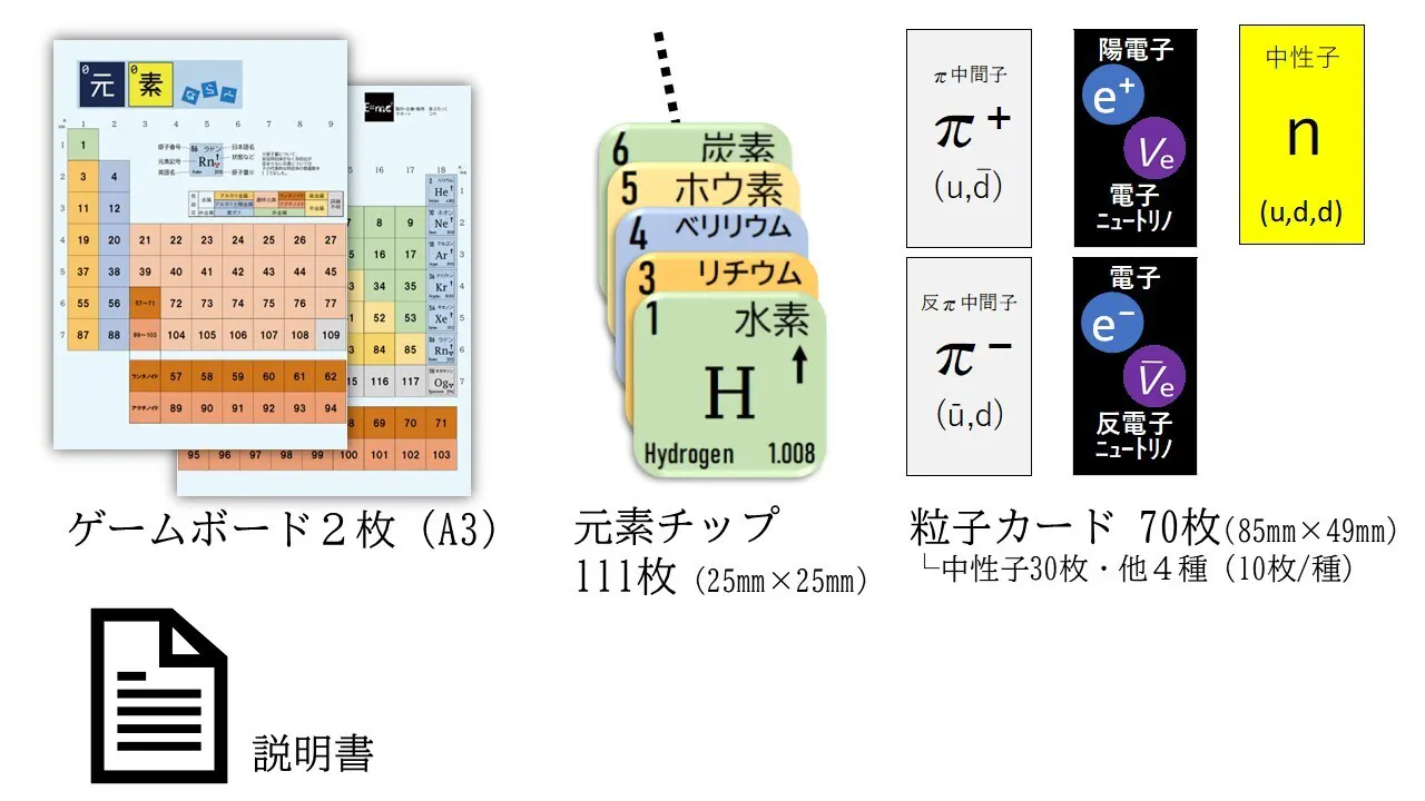 ゲームボード2枚(合わせて周期表1枚)・元素パッチ111枚・粒子カード70枚・説明書1部