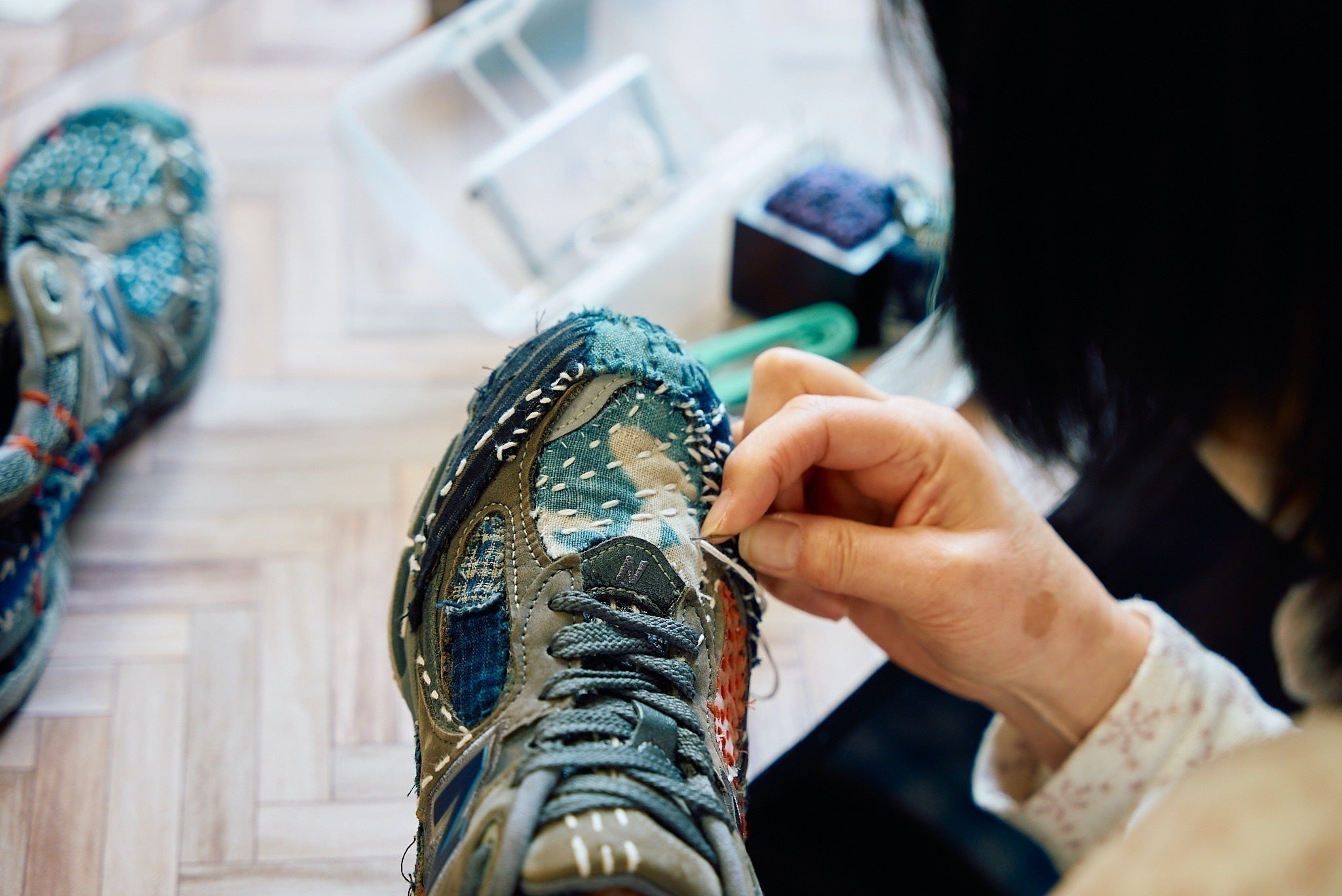 上の写真が出来上がりサンプルです。ちなみに、作業の効率化ができたと言っても、スニーカーの両足を仕上げるのに掛かる時間は15〜18時間! 大変な分だけ、刺し子さんがこのサービスにかける意気込みも激しく、一針一針心を込めてリメイクしています。