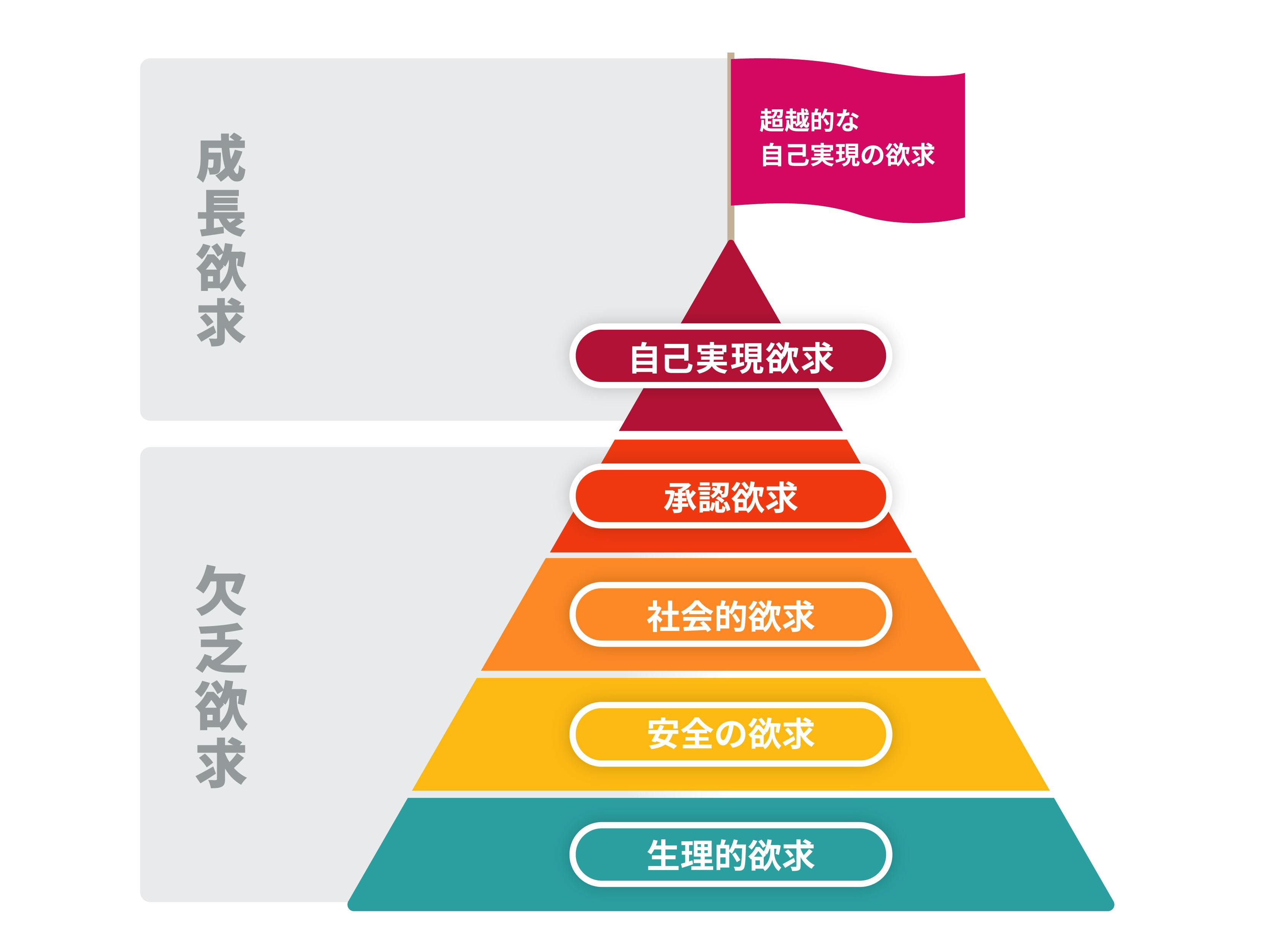 人には5つの欲求があり、それらが積み重なって一つのピラミッドを構成しており、一つずつ欲求を満たしていくことで「自己実現」にむかっていくといわれています。
