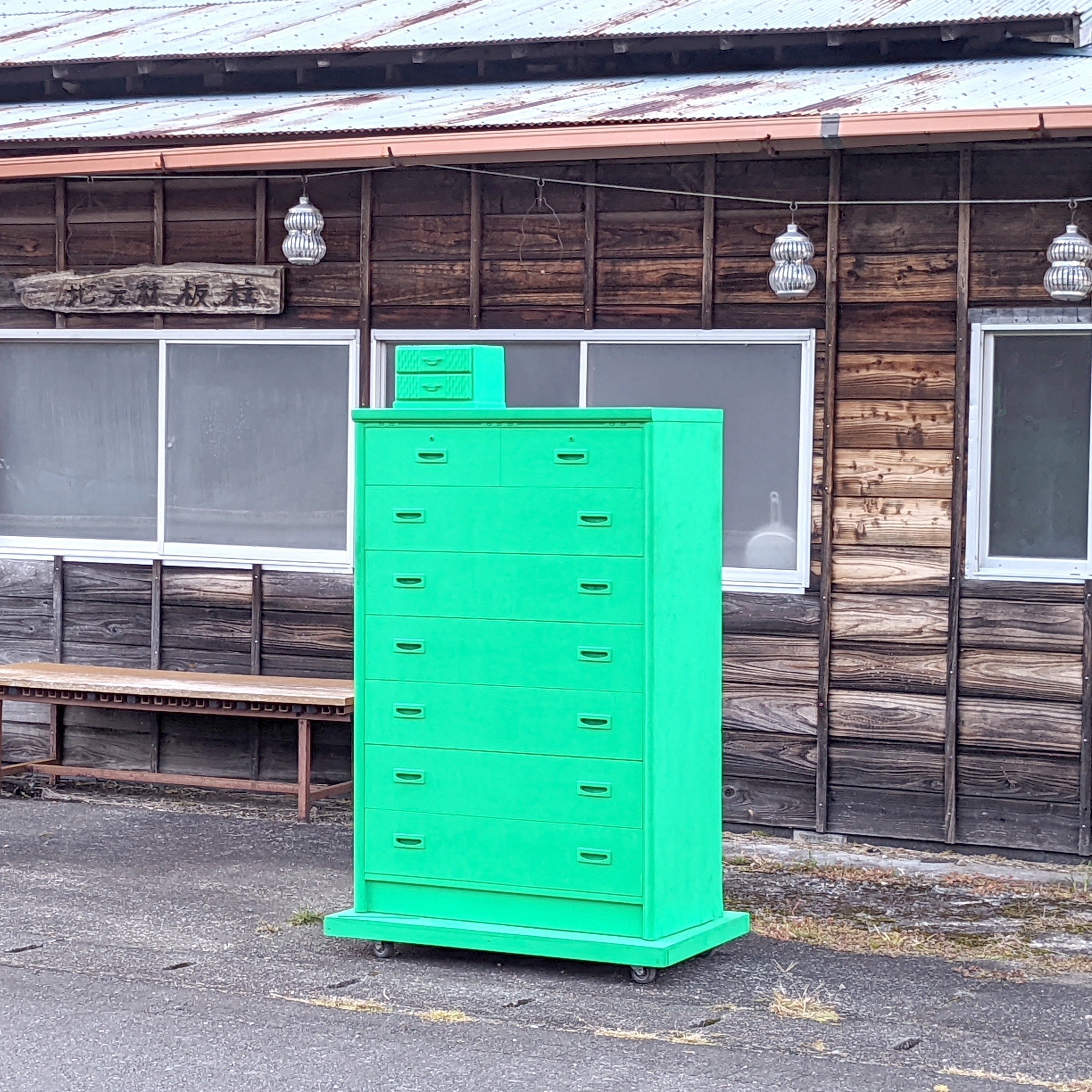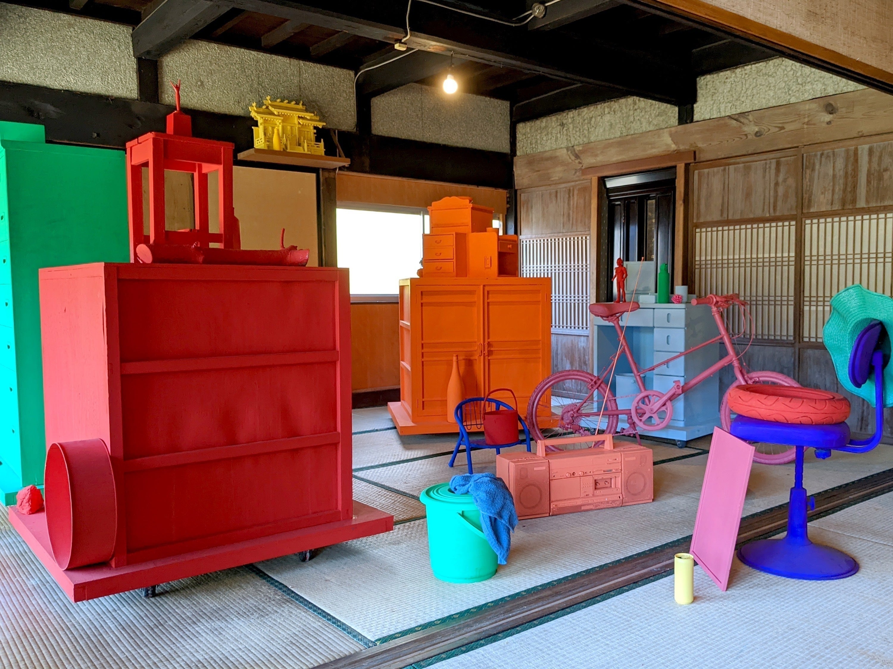 本作「NEW OPEN」は、原泉地区の空き家に置き去りにされた家具や家電に「新たな門出を与えたい」と願い、制作いたしました。