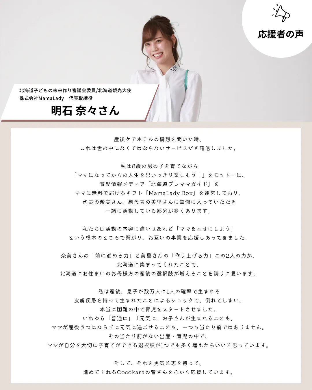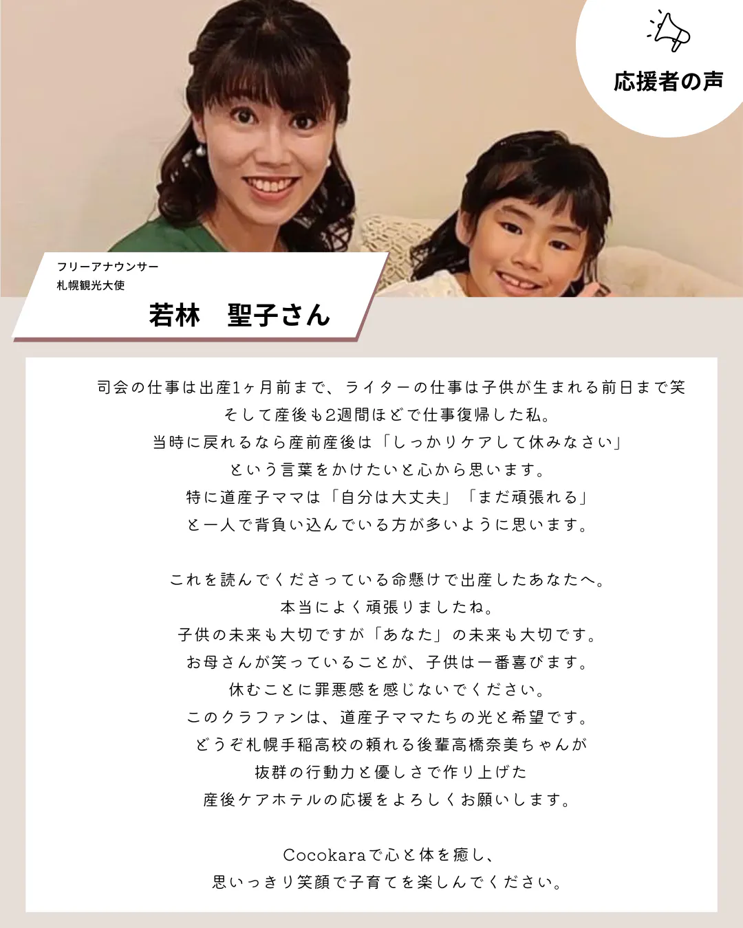 "Cocokara"(ココカラ)の代表高橋奈美です。