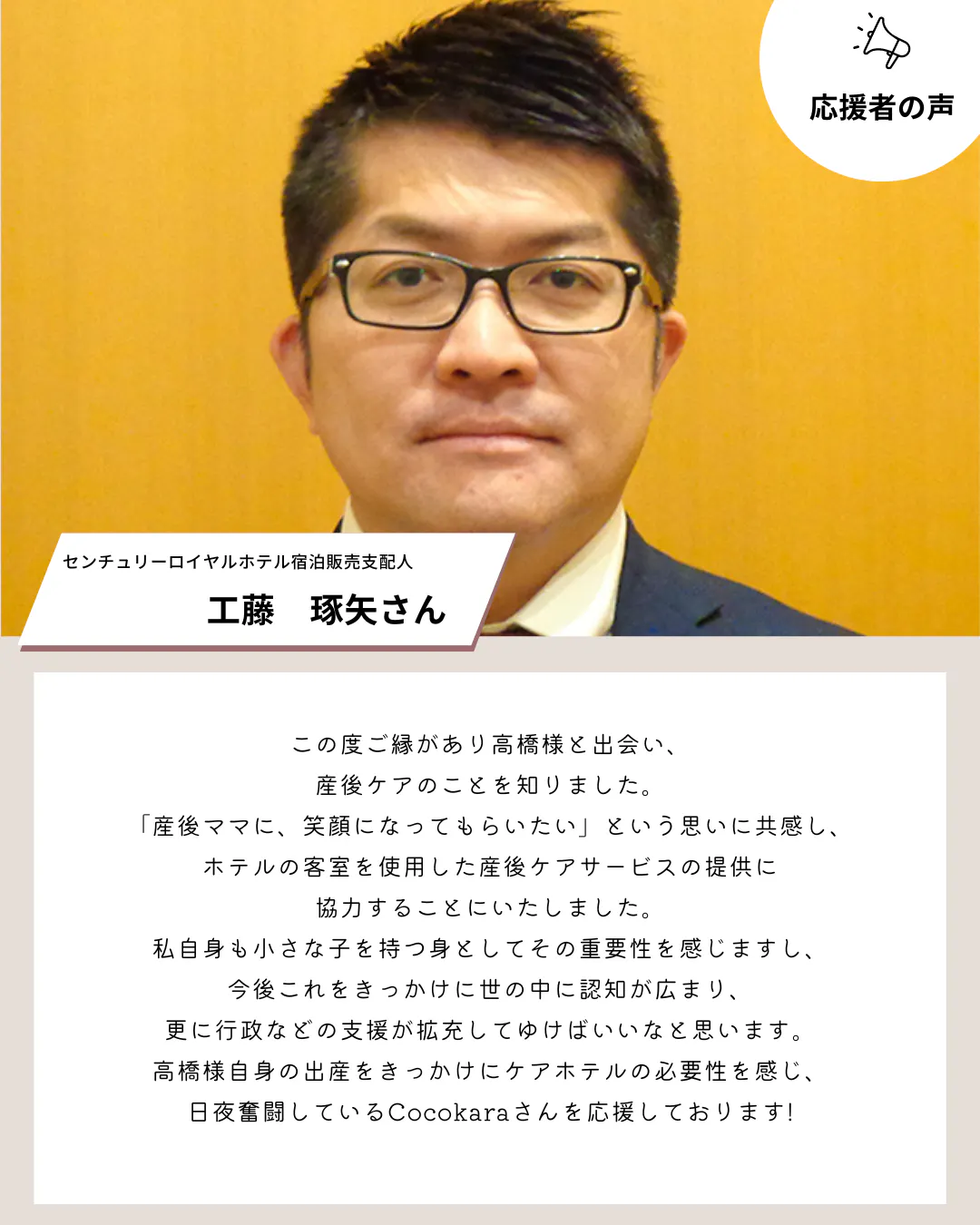 2024/02/28 17:30いつも応援ありがとうございます。Cocokara代表の高橋奈美です。1月末から始めたクラウドファンディングもついに明日で最終日となりました。この約1か月間で、センチュリーロイヤルホテルさんにて2回産後ケアを実施させていただき、改めて本当にママたちから必要とされている場所だと感じ、今後もしっかり継続できるように頑張ろうと身が引き締まりました。「Cocokaraの予約ができた時点で、あと少しで頼れる場所がある!と思えてそれまで先が見えない育児に気持ちが落ち込んでいましたが、とても気が楽になりました」と言っていただいたお客様がいらっしゃいました。産後に安心して頼れる場所があること。それがどれだけ大事なことか、改めて痛感したお言葉でした。より多くのママに心からの安心をお届けしたいです。残り54,000円でネクストゴールを達成、+2名のママにご宿泊いただけるようになります。1,000円からご支援可能なので、是非最後にもう一度ご協力宜しくお願い致します!!! もっと見る
