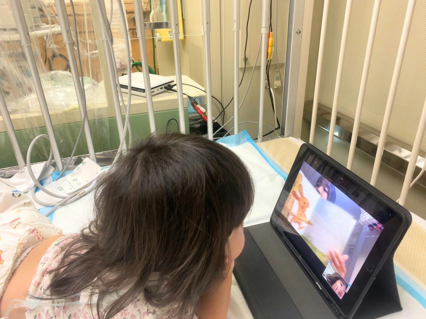 入院中、感染症予防のため面会できる方々にも制限があったり、病室が出られなかったりと、活動が限られます。その場合は写真のようにオンラインで読み聞かせを行ったりと、できる事を探して、少しでも入院中も楽しい時間を過ごせるよう工夫をしています。