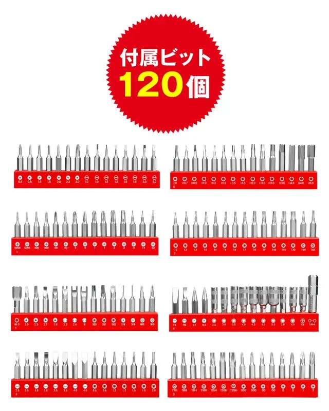 【KAIWEETS マルチビット電動精密ドライバー】は汎用ネジと特殊ネジに対応するビットが合計120個もセットになっています。