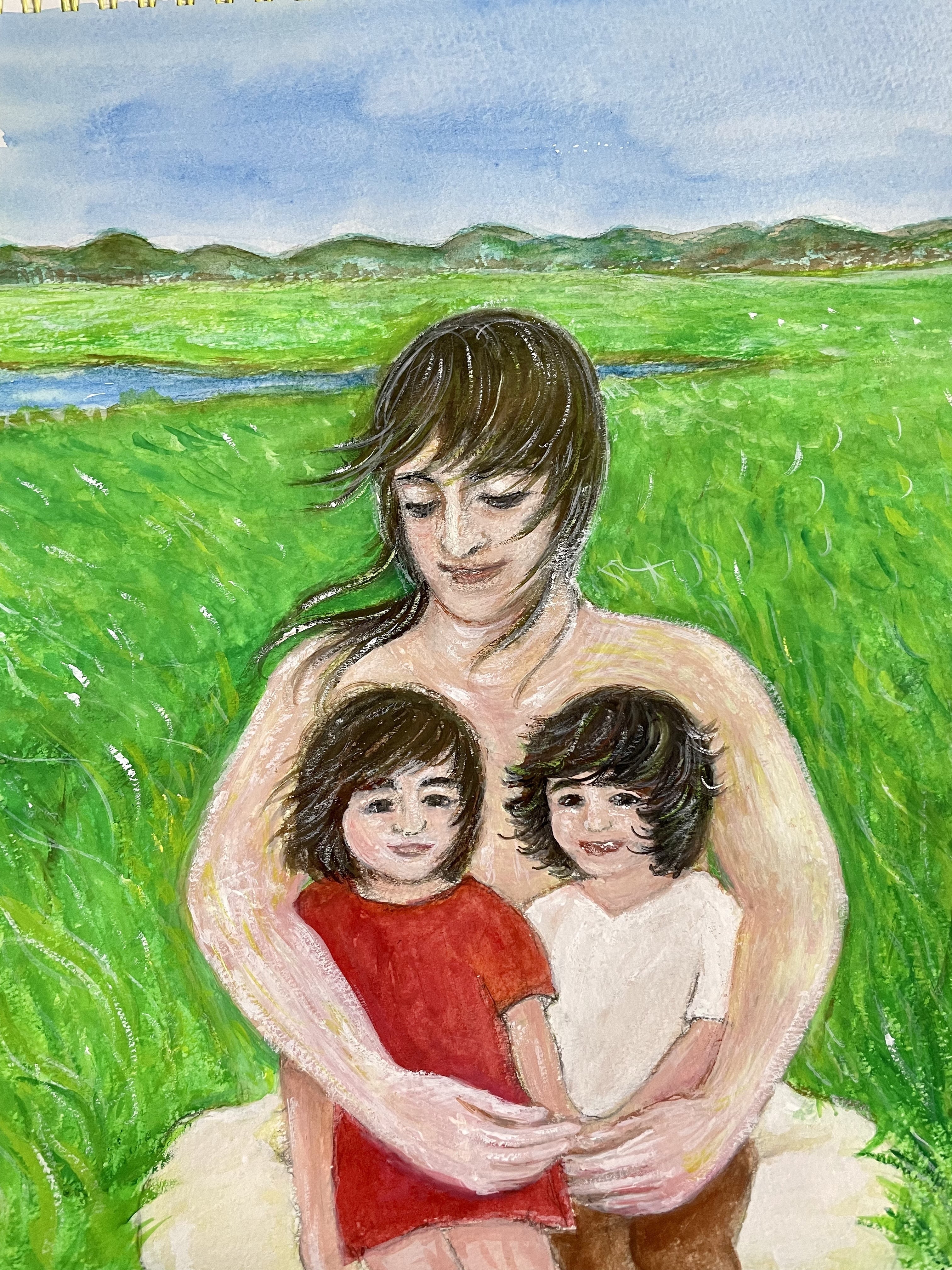 遠く湖をかかえた草原を背景に、二人の子どもを抱え、愛おしい眼差しを向ける。
