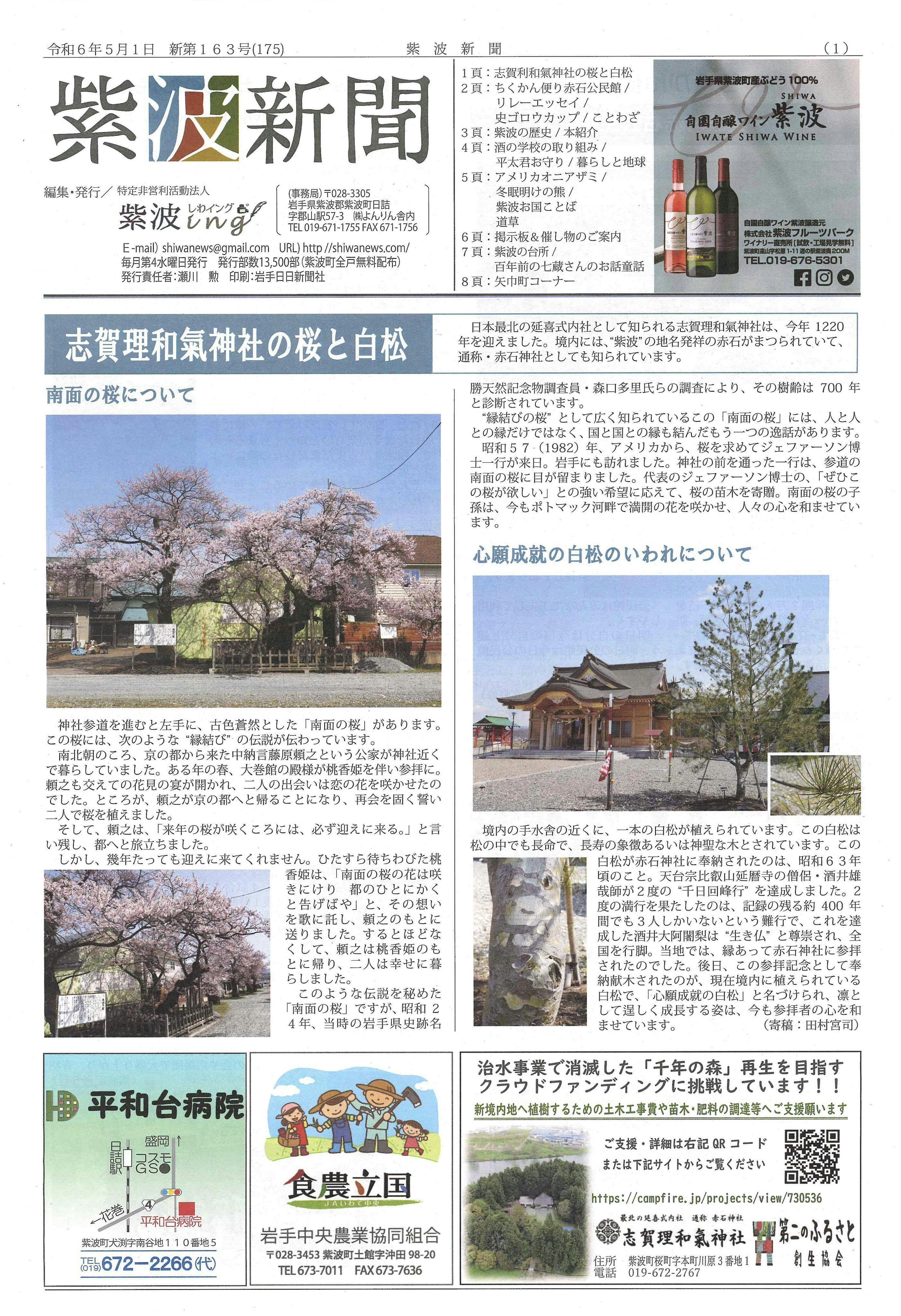 地元紫波町の地域新聞、紫波新聞の一面に志賀理和氣神社の南面の桜と白松の記事が掲載されました。