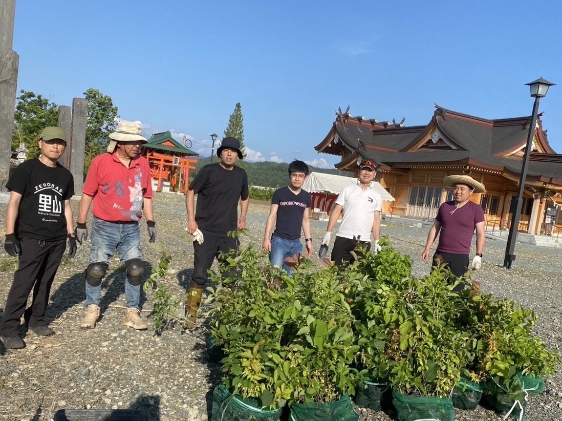写真に写っているのは、第二のふるさと創生協会の髙橋代表理事、グリーンエルム(里山ゼロベース)の西野博士、磯野さん、エイコンファームの箱崎さん、植樹ボランティアの藏重さん、私です。