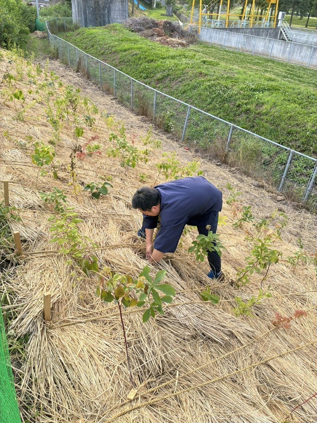 早く雨が降ってくれることを祈りつつ、木々に水を撒きながら、苗木が寝てしまっていないか、藁が偏っていないか観察をしています。