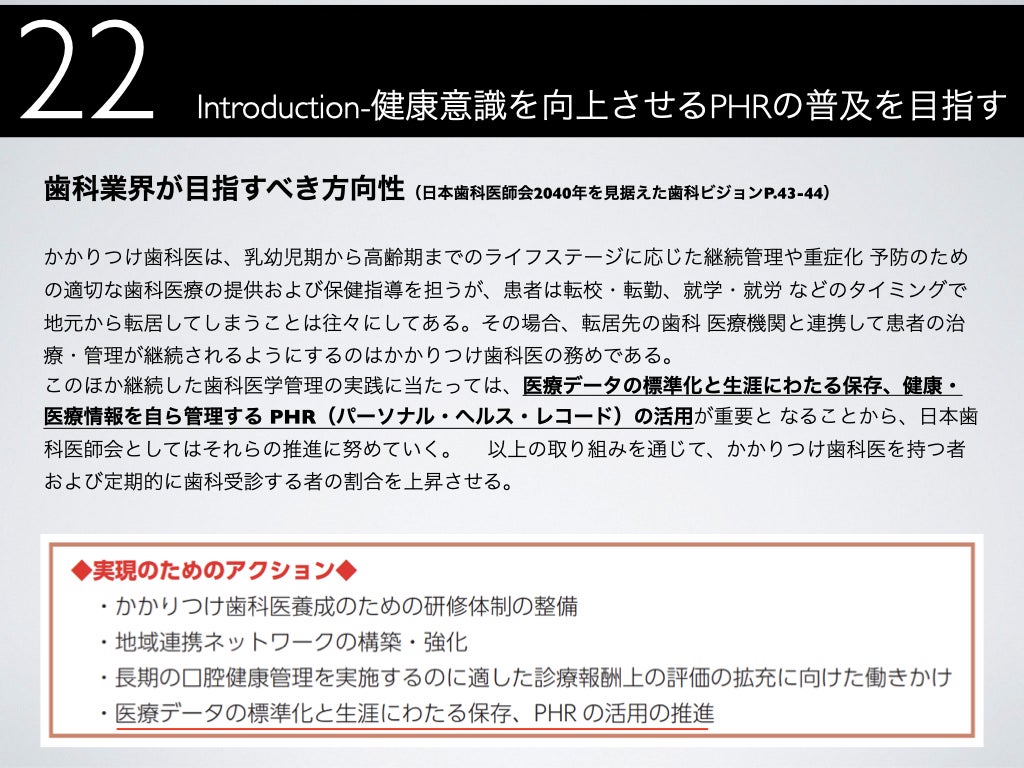 患者が自ら自分の医療情報を管理していく(パーソナルヘルスレコード)社会を実現したいと考えています。