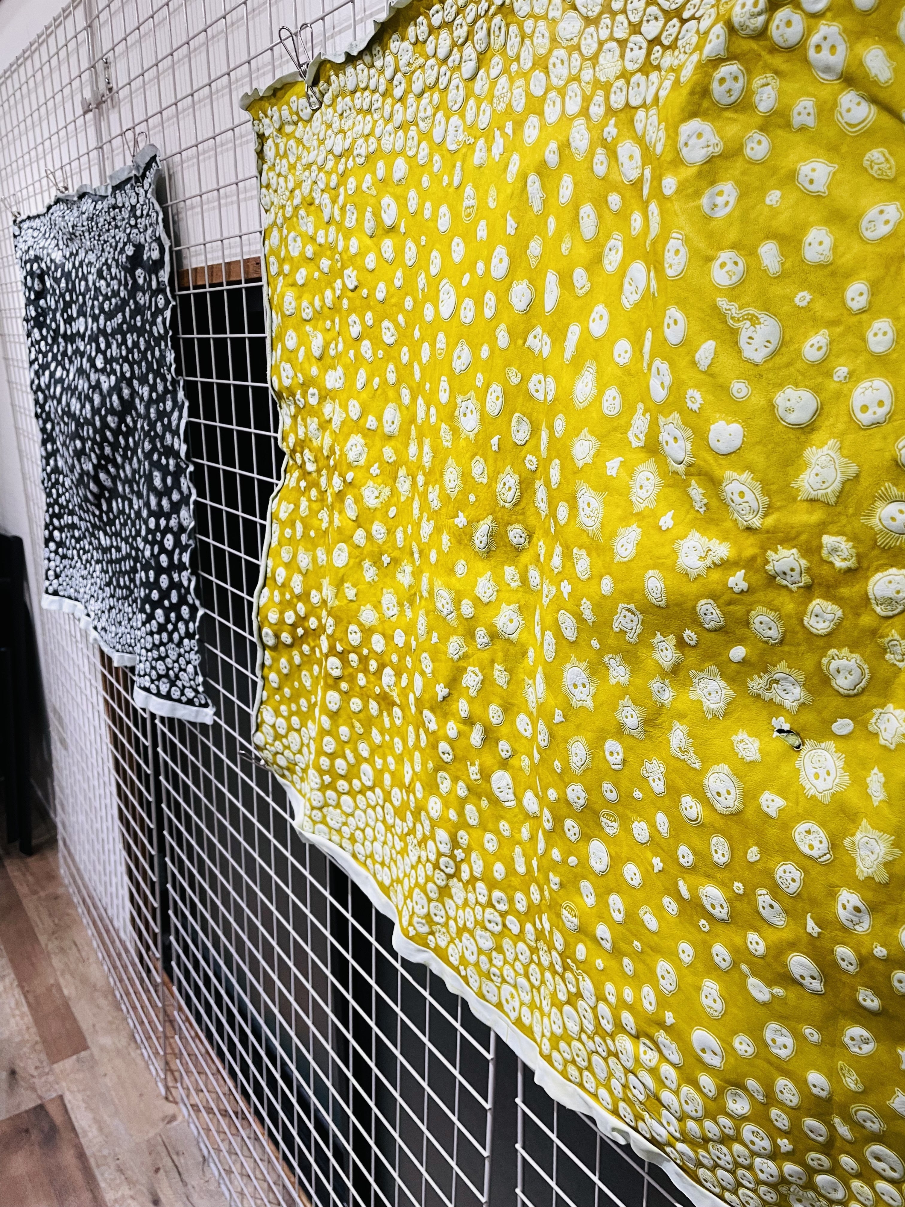 広い空間なので、ガイコツレザーそのまま展示しています。革全体の模様も見て頂けたら嬉しいです。