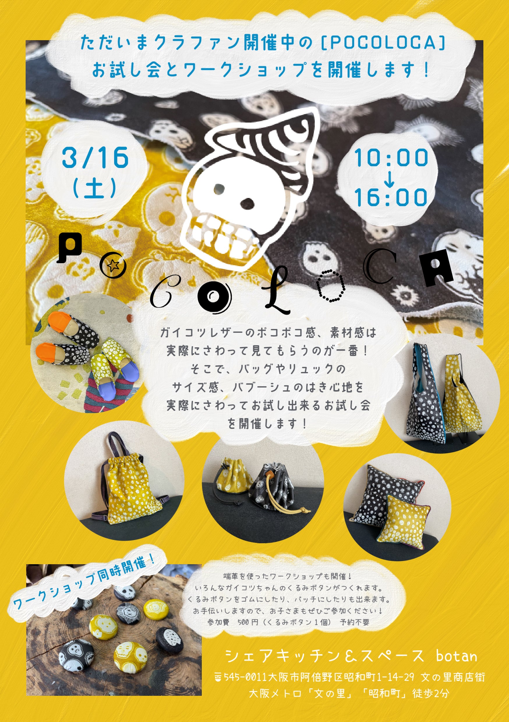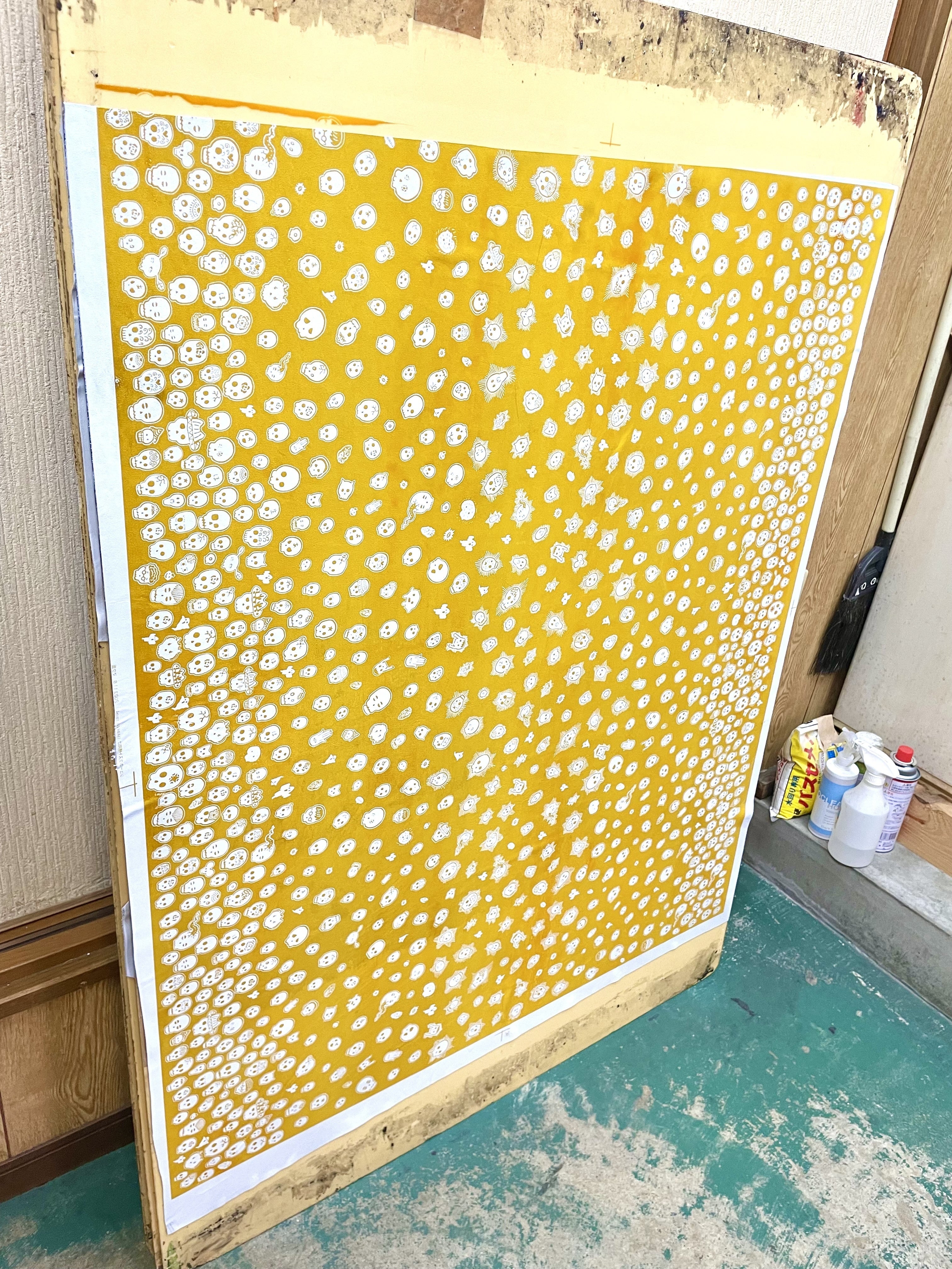 リターン製品の生産始まってます。まずは素材の革を用意するところから。革屋さんから無染色の牛革を仕入れ、染め屋さんに持って行きます。染め屋さんは大阪市生野区にあるタケグチさん。凹凸になる「革友禅染め」を専門に染めている特殊な工房です。革を版の大きさに裁断して、版台に張っていきます。色ものは革のロットが変わるとその都度色出しして確認します。染めはコンパクトな工房で行われています。「あまり大きくしても余計な動きが大きくなるし、自分1人にはちょうどいい」とおっしゃる通り、コンパクトな中に染めに必要な工程がしっかり組み込まれています。版を定位置に設置したら、勢いをつけて同じ圧力で一往復!刷りはあっという間に終わります。*刷りの工程は、Instagramに動画であげています。こちらも是非ご覧ください。乾燥させた後、蒸し器で蒸します。一度に革10枚が入る蒸し器は内部が大体90度〜95度になるそう。この工程で特徴の凸凹が出てきます。革によっては全然凹凸が出てこないものもあるそうで、温度を上げたり、時間を伸ばしたり、いろんな調整を行います。蒸しあがったら洗いの工程へ。ここでも色が思ったより落ちたり、色移りを起こしたりすることもあるらしく、ヒヤヒヤが続きます。この工程をすることで「洗える革」になります。洗い終わったら乾燥させればやっと完成です!今回はヤマブキ色の色出し確認。色も凹凸も良く出たので本番に進んで頂きます!いろんな試練のある染め工程。ここまで来てようやく職人さんもホッとするそうです。綺麗に出来るのが当たり前だけど、当たり前じゃないんだなぁと実感しました。この革が皆さまの元へ届きます。楽しみにお待ちください!