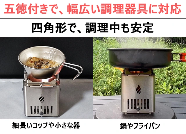 組みこまれている五徳を展開することで、お鍋やフライパンなどが安定した状態で、調理を楽しむことが可能です。