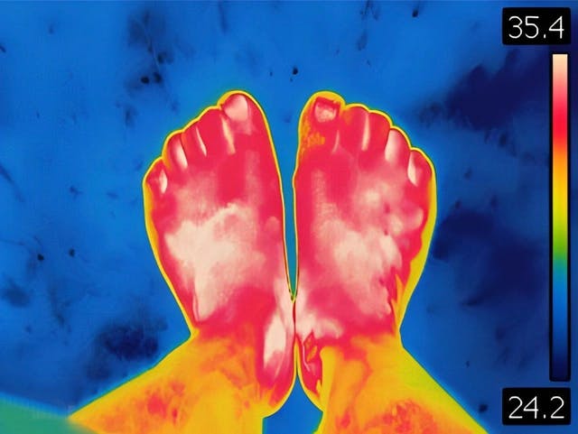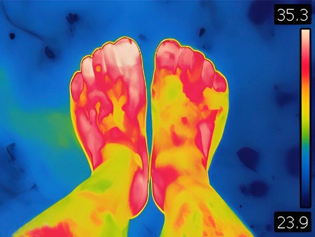 丁度ブーツの形に合わせて足全体が白くなり、温まっているのが分かります