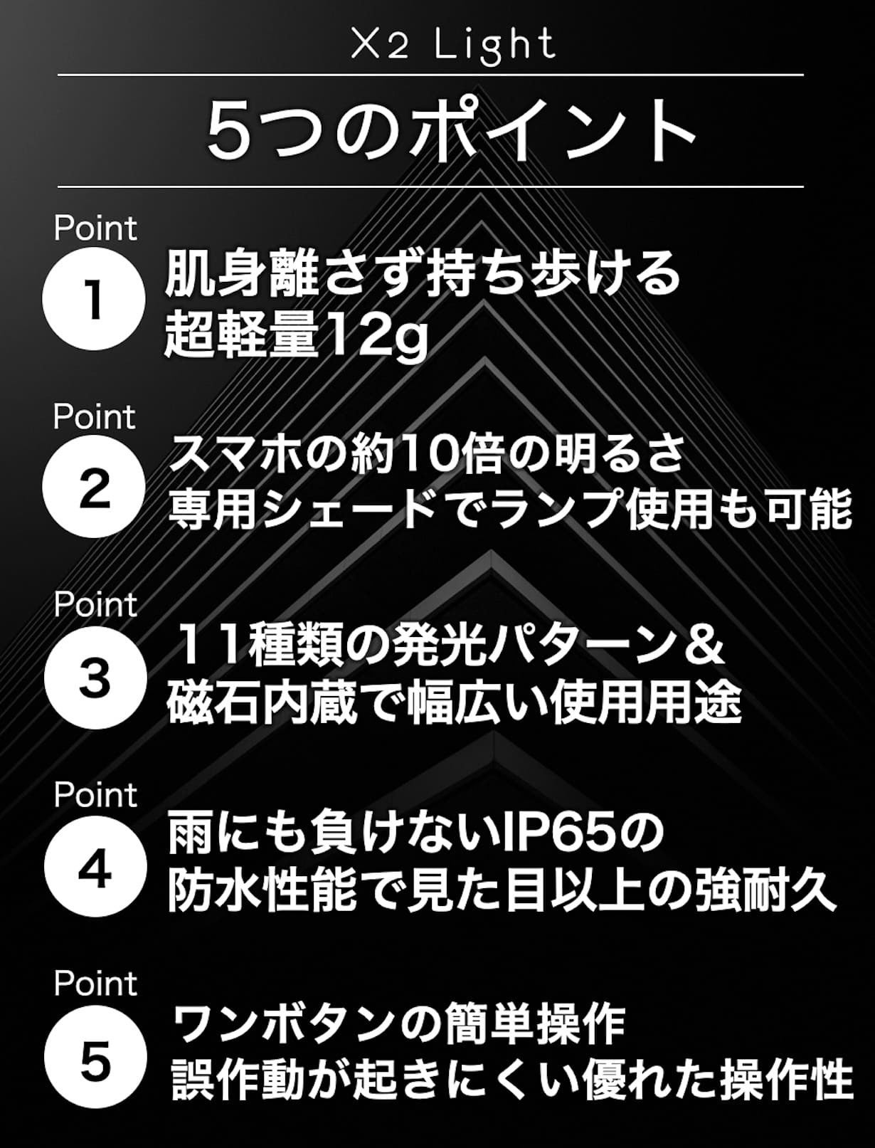 いつも持ち歩いてすぐに使える『X2 Light』暗い夜道を照らしたり、防犯や災害時の防災グッズとしても常に持ち歩ける実用的なお守りです。
